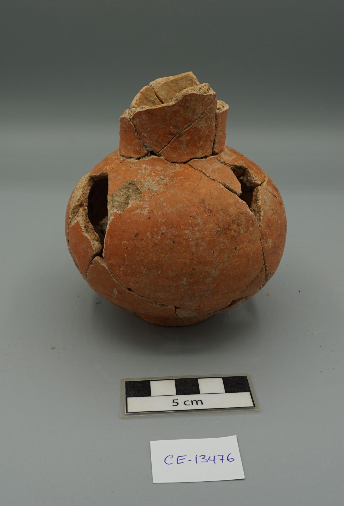 3566 - Jarra globular de base anular, cuello corto y borde plano. Engobe rojo en la superficie exterior.