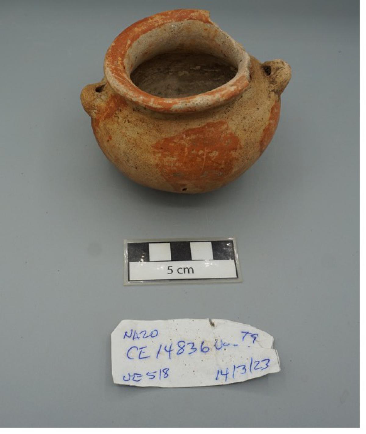 3560 - Olla con borde envesado, con línea roja y asa en el cuerpo, sin soporte.