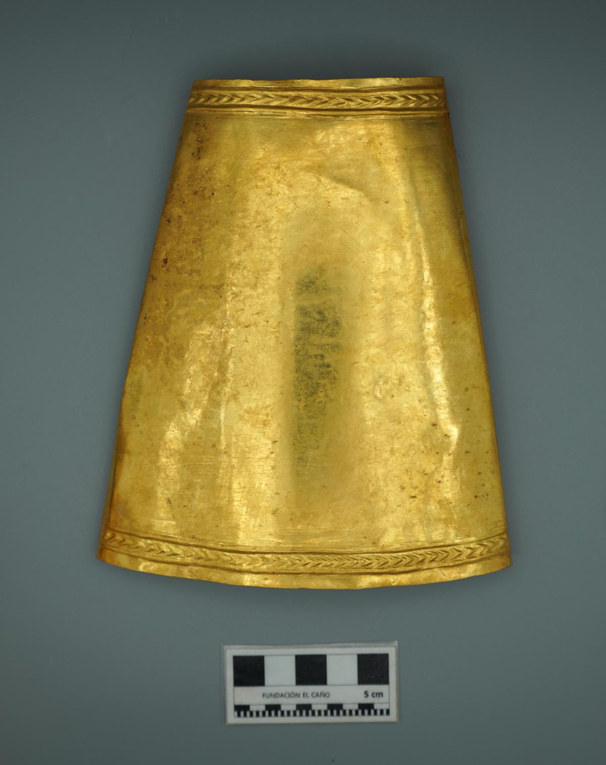387 - Pectoral de oro martillado repujado con la representación frontal del rostro de un ser sobrenatural con rasgos de un anciano que formaba parte del ajuar del Individuo 20, un infante, de la ...