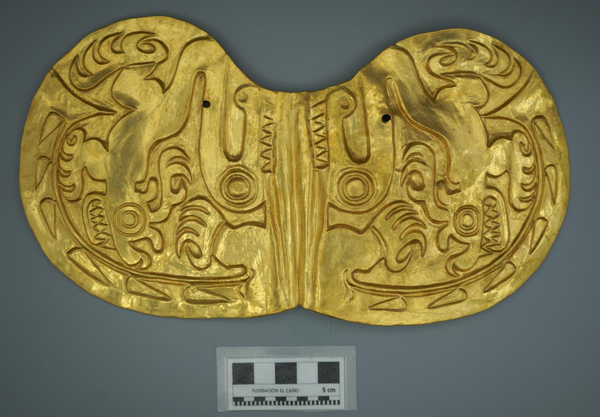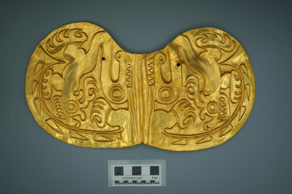 386 - Pectoral discoidal de oro martillado y repujado con la representación de un ser sobrenatural en forma de cocodrilo bicéfalo. Estilo Conte. Tiene cuatro orificios de suspensión alineados ...