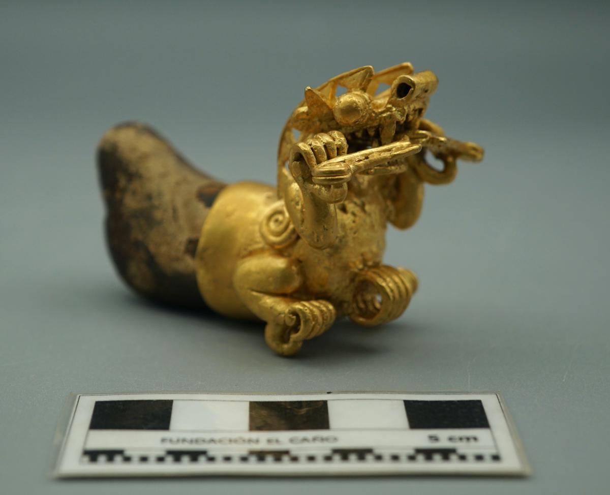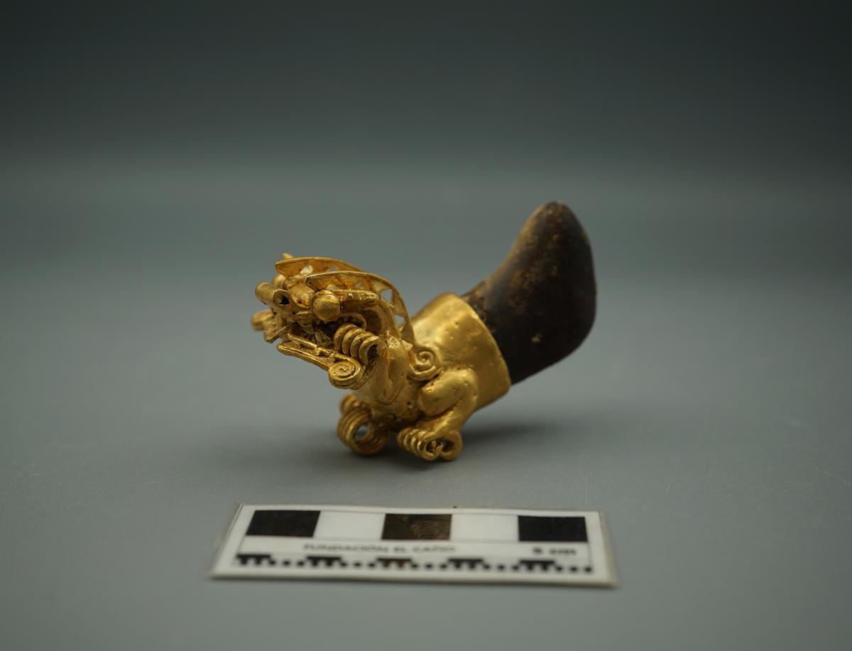 377 - Pendiente figurativo de oro fundido con la representación de un murciélago bicéfalo en vuelo que formaba parte del ajuar del individuo I5 de la tumba T2. EL aro de suspensión se localiza...