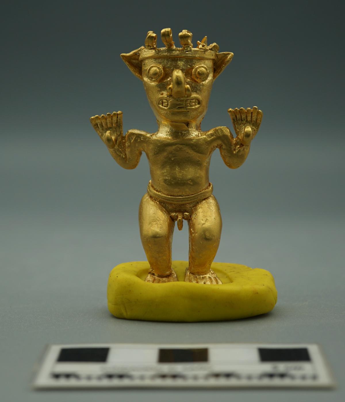 Vista frontal del pendiente figurativo de oro fundido AU15403 representando un ser sobrenatural en forma de murciélago antropomorfo.
