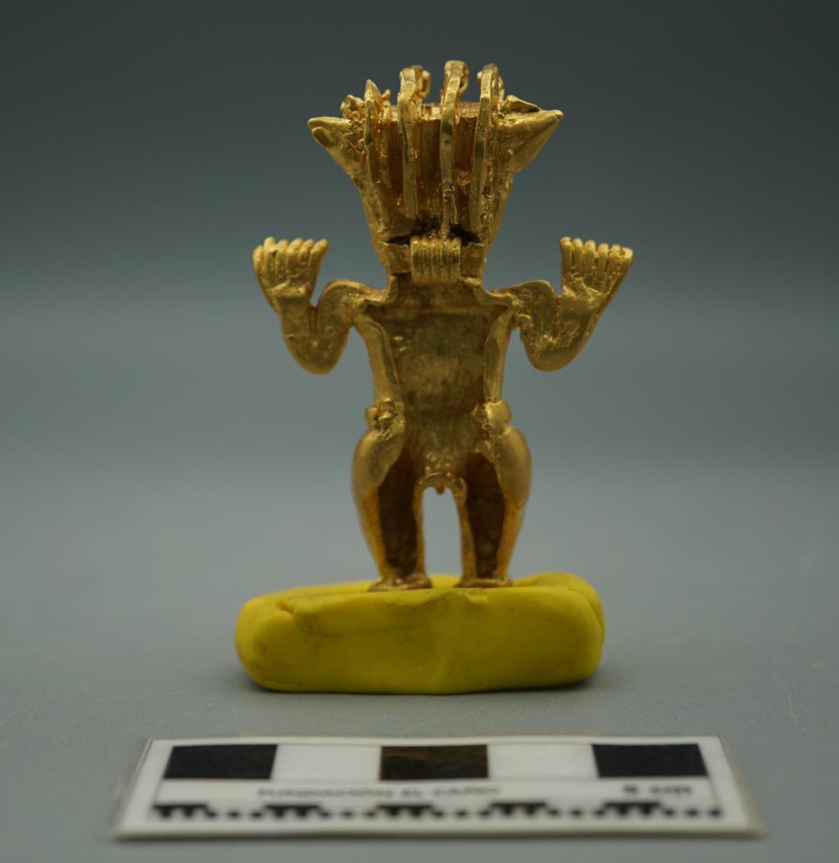 Reverso del pendiente figurativo de oro fundido AU15403 representando un ser sobrenatural en forma de murciélago antropomorfo.