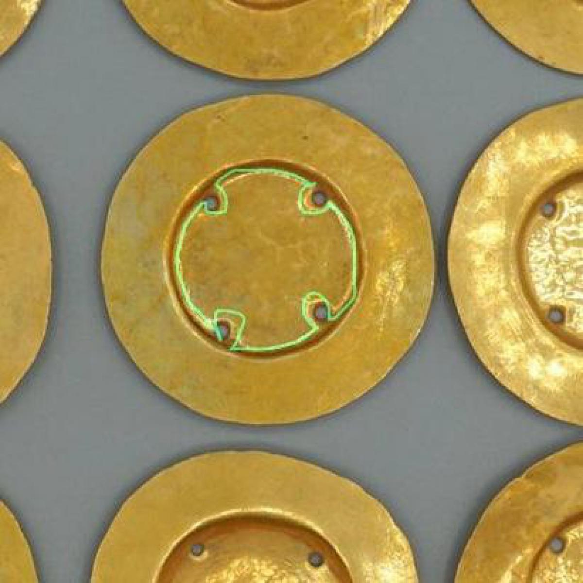 387 - Pectoral de oro martillado repujado con la representación frontal del rostro de un ser sobrenatural con rasgos de un anciano que formaba parte del ajuar del Individuo 20, un infante, de la ...