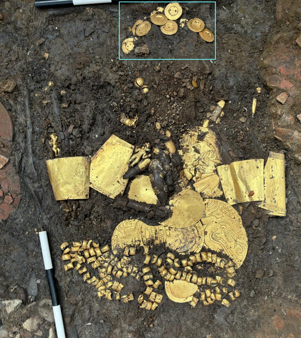 Vista del ajuar funerario y restos del individuo I10 remarcado el punto en que se encontraron las placas de oro (la mayoría debajo del cráneo, pegadas a su frente porque el señor fue enterrado boca abajo y el resto sobre parte del cráneo).