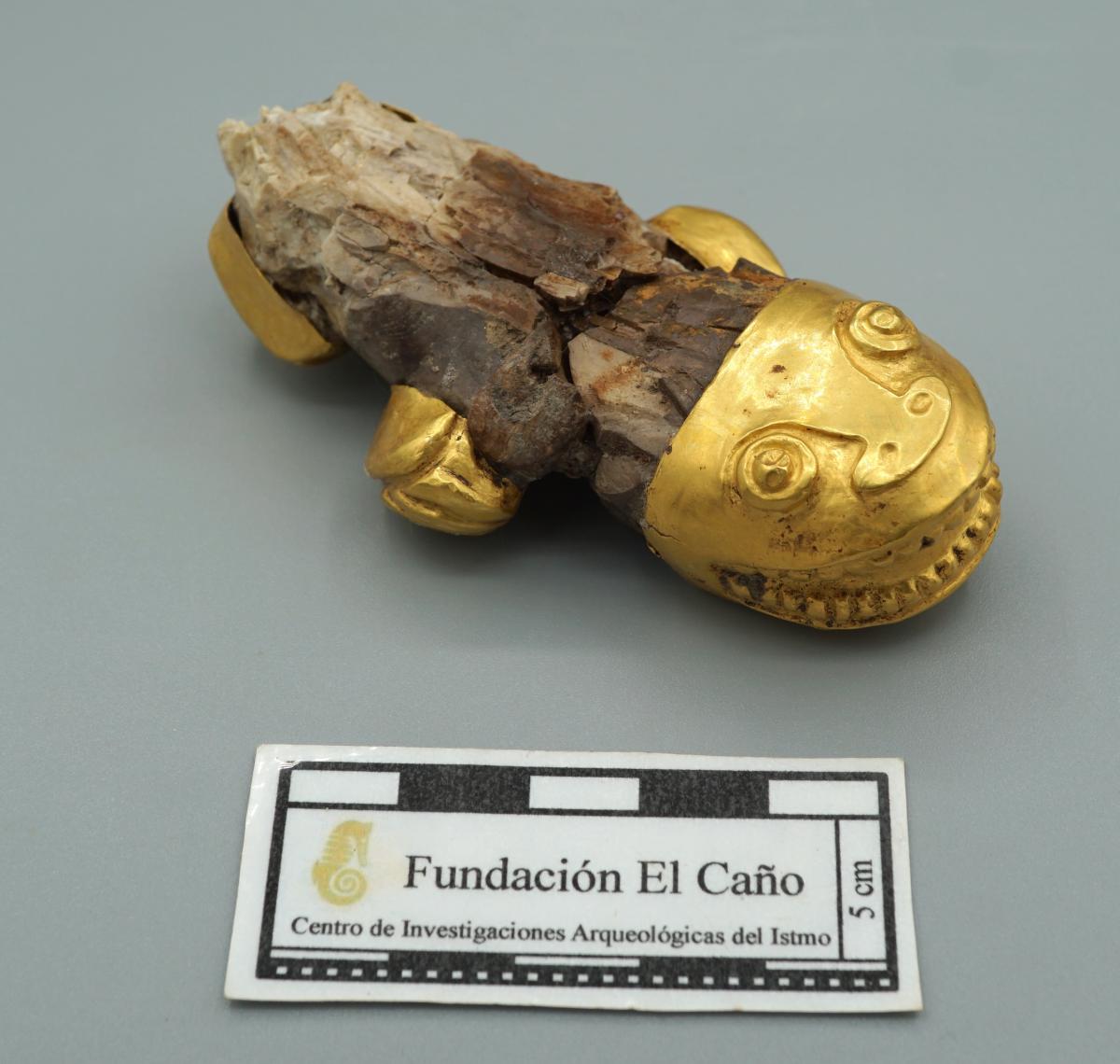 Pendiente figurativo de diente de cachalote y fundas de oro. Después de la restauración.
