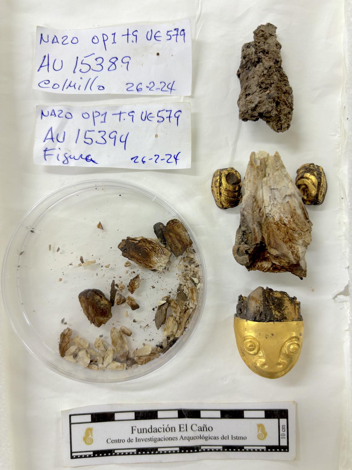 387 - Pectoral de oro martillado repujado con la representación frontal del rostro de un ser sobrenatural con rasgos de un anciano que formaba parte del ajuar del Individuo 20, un infante, de la ...