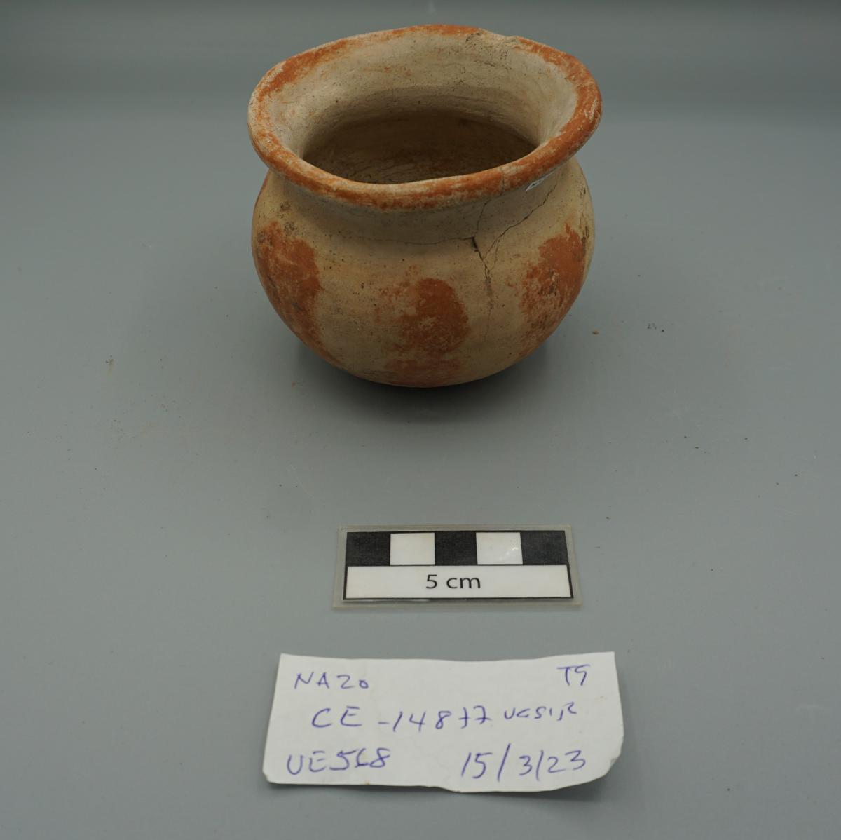 3566 - Jarra globular de base anular, cuello corto y borde plano. Engobe rojo en la superficie exterior.