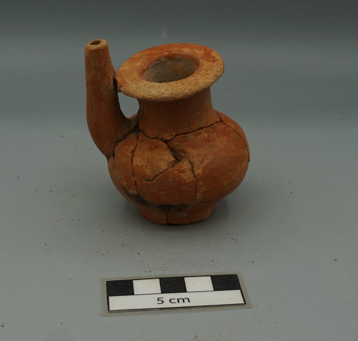 3659 - Jarra globular conte roja, con base anular, borde acanalado y vertedero adosado al labio.
