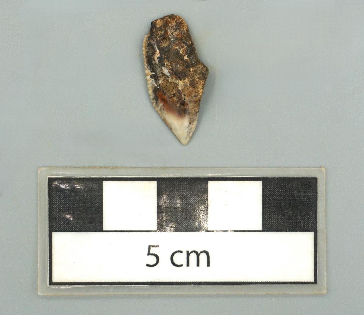 3571 - Diente perforado de tiburón. La perforación indica que pudo haber formado parte de un artefacto ornamental.