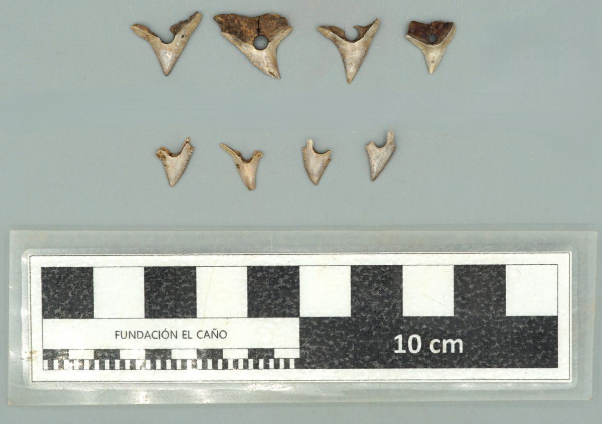 Conjunto de dientes de tiburón, mayormente fragmentados, con perforaciones, posiblemente formaron parte de un mismo collar o pulsera.