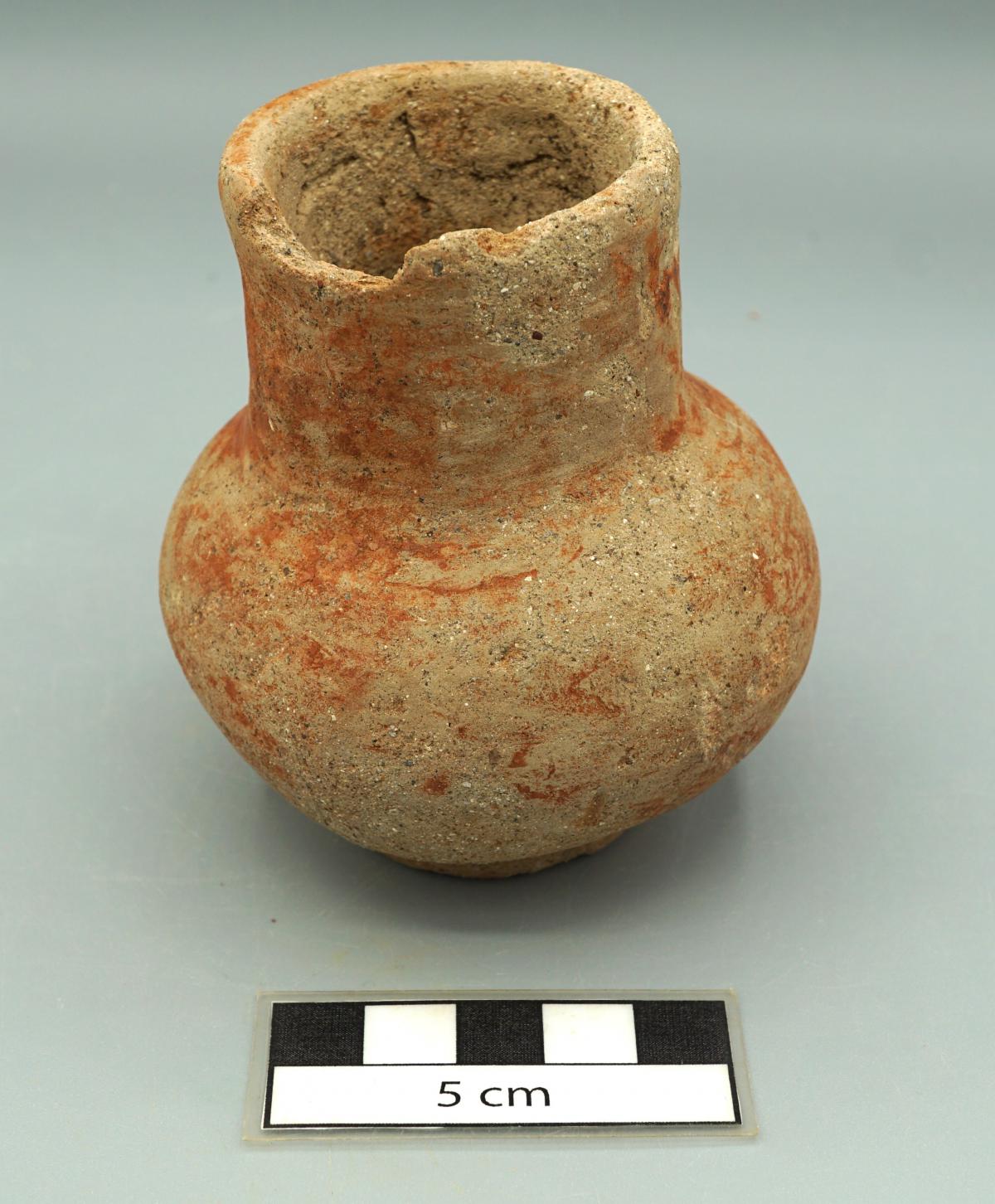 3566 - Jarra globular de base anular, cuello corto y borde plano. Engobe rojo en la superficie exterior.
