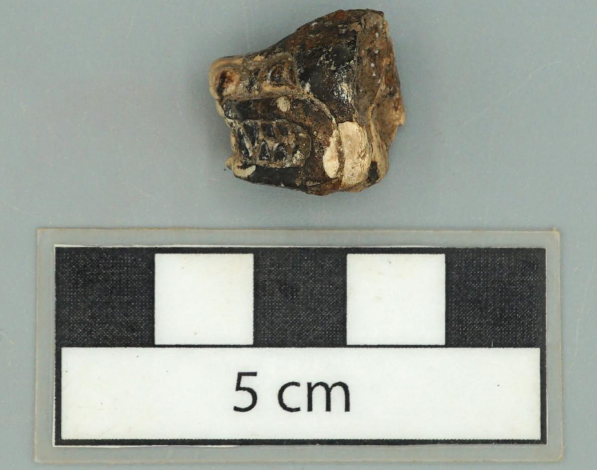 Vista frontal de la iconografía de una cabeza de felino tallada y pulida en hueso de fauna. Se pueden apreciar varias facciones como los ojos, dientes y nariz. También se puede apreciar algún tipo de pátina negra sobre la superficie de la pieza.