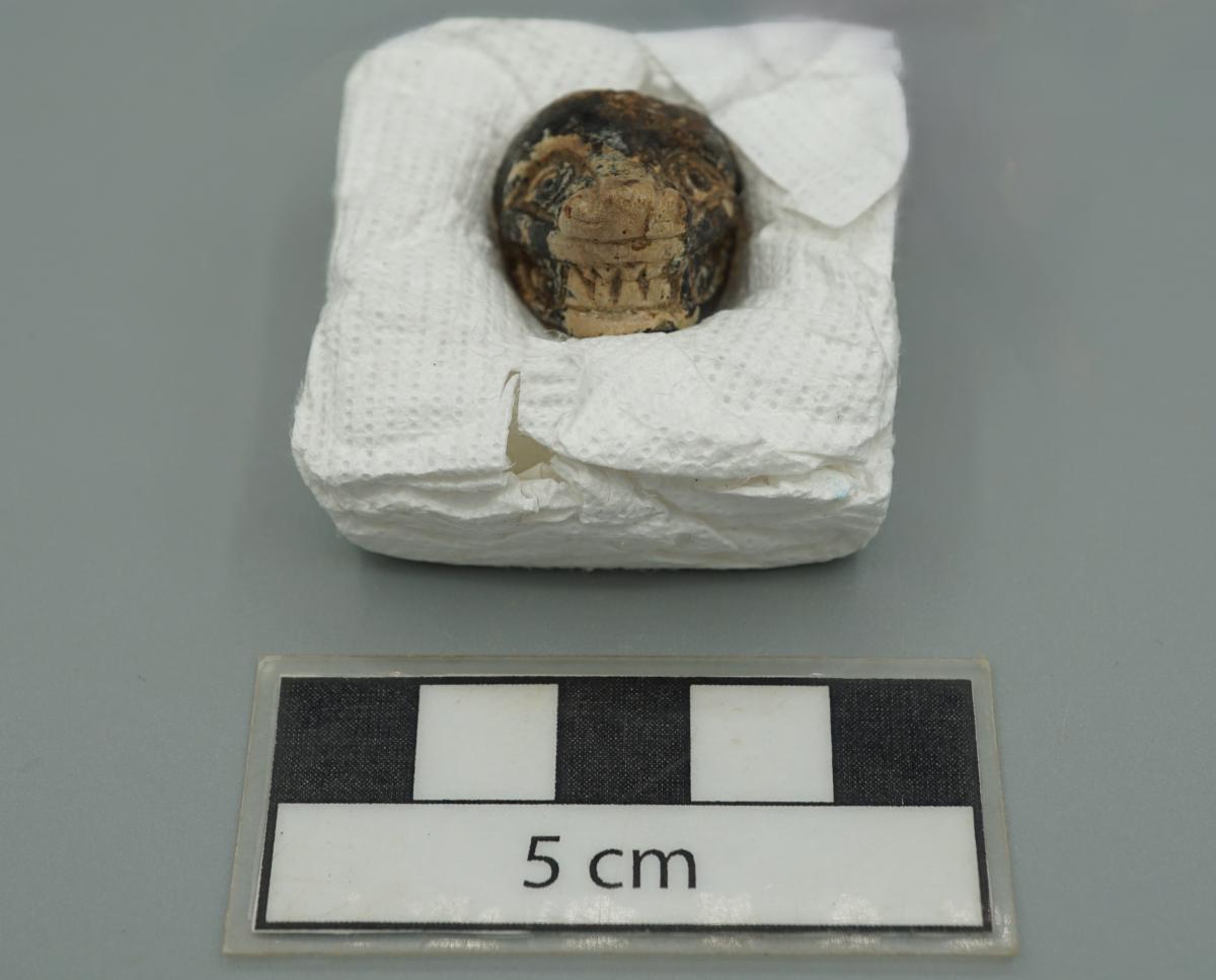 3653 - Efigie híbrida antropo-zoomorfa (humano-cangrejo) polícroma, sin base anular.