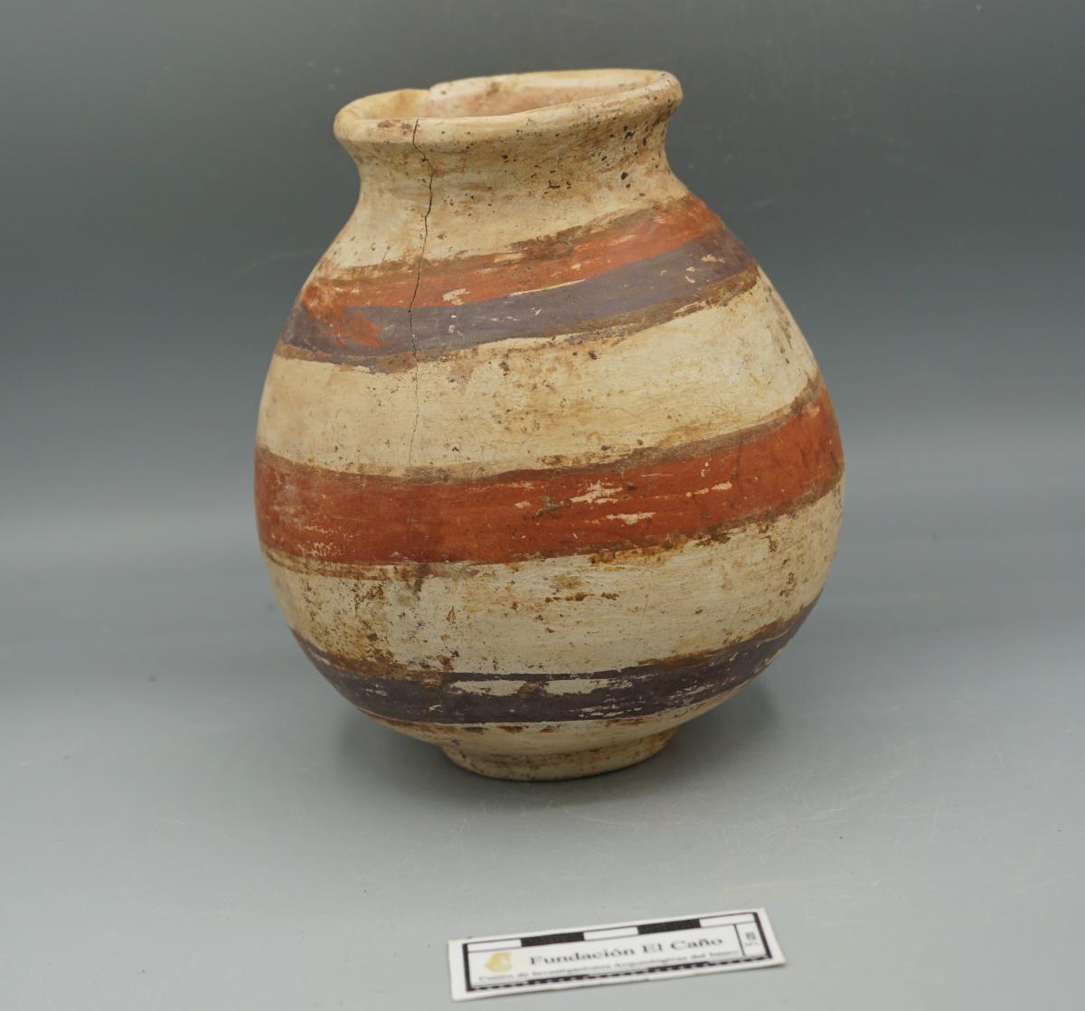 376 - Jarra polícroma carenada con hombros alzados y cuello largo. Engobe blanco y decoración de bandas de color alternas rojas y moradas.