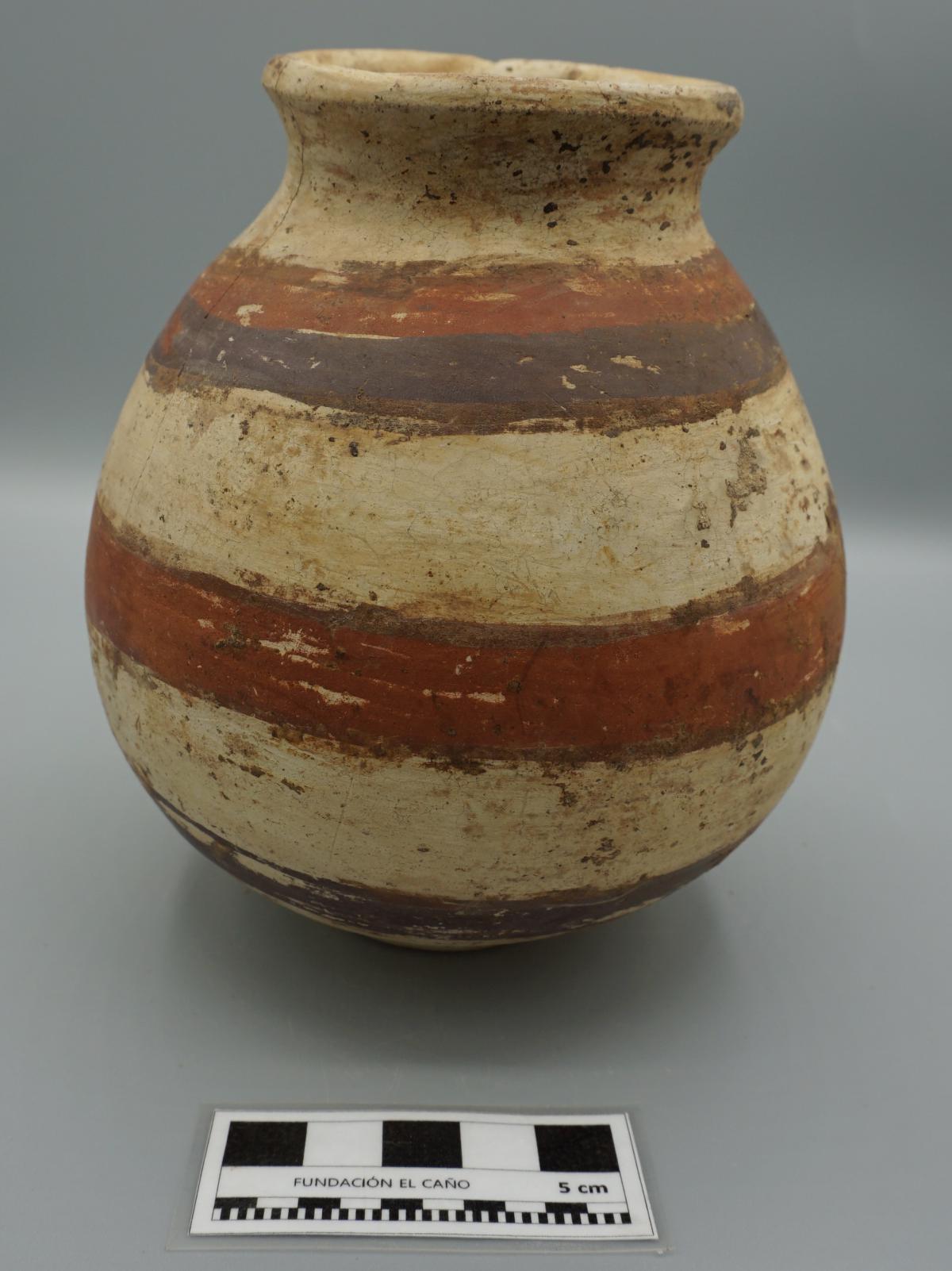 3559 - Jarra cilíndrica de cuello corto, del estilo Conte Policromo, decorada con líneas horizontales.