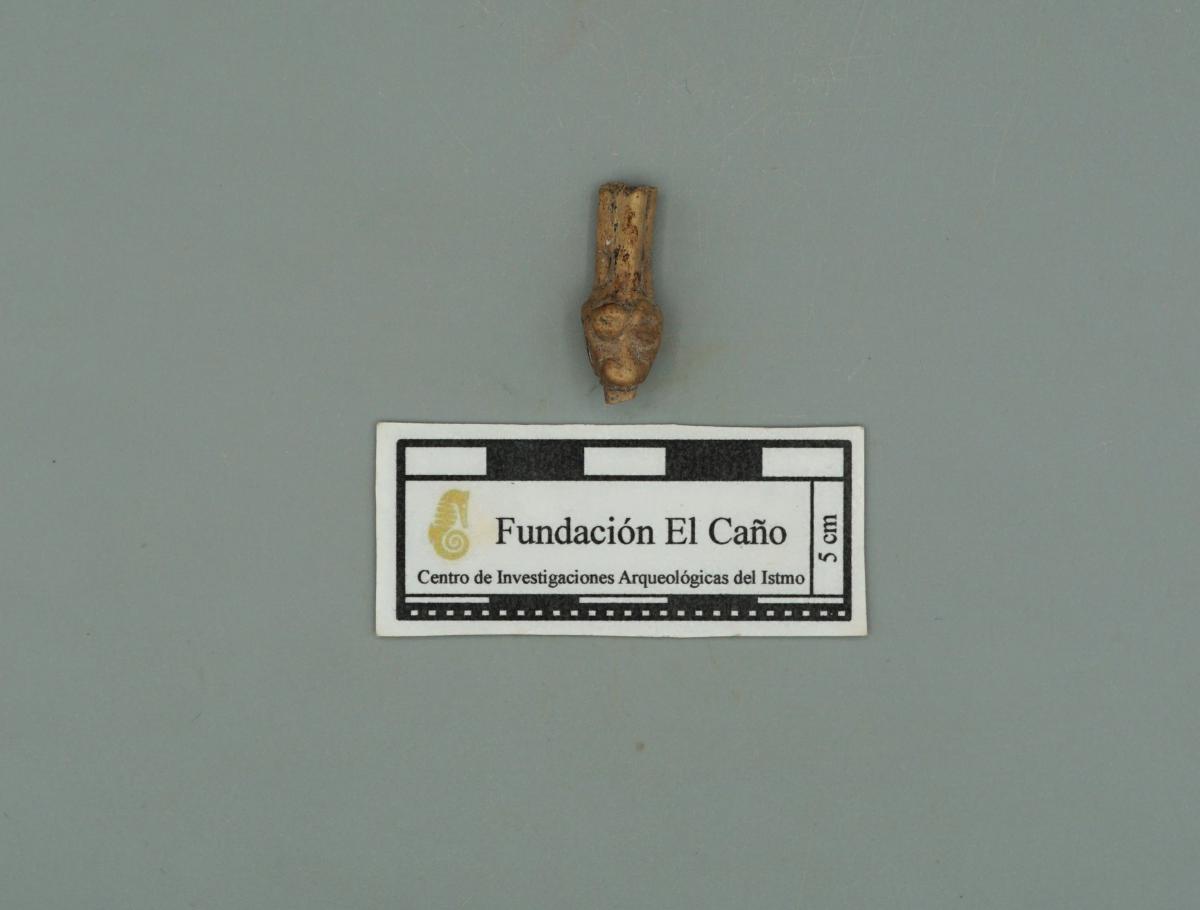 Vista del anverso del hueso de fauna tallado, se pueden apreciar los ojos de la figura, que representa una serpiente.