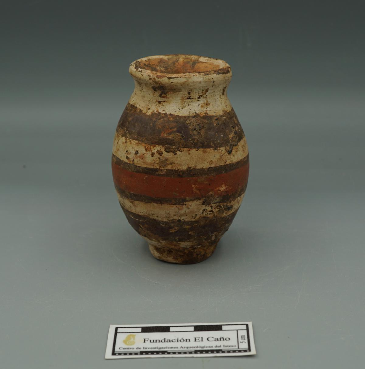 3559 - Jarra cilíndrica de cuello corto, del estilo Conte Policromo, decorada con líneas horizontales.