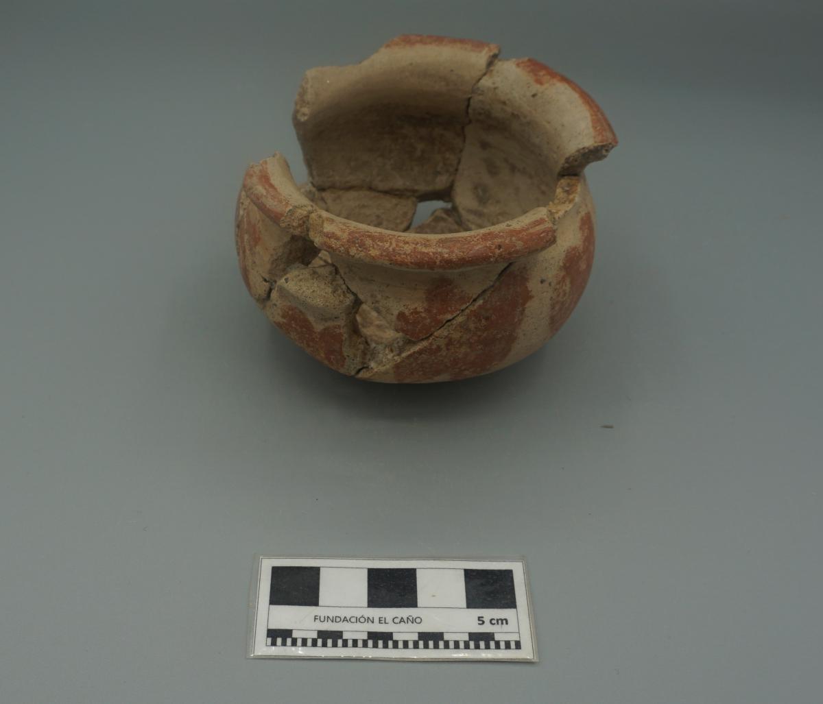3566 - Jarra globular de base anular, cuello corto y borde plano. Engobe rojo en la superficie exterior.
