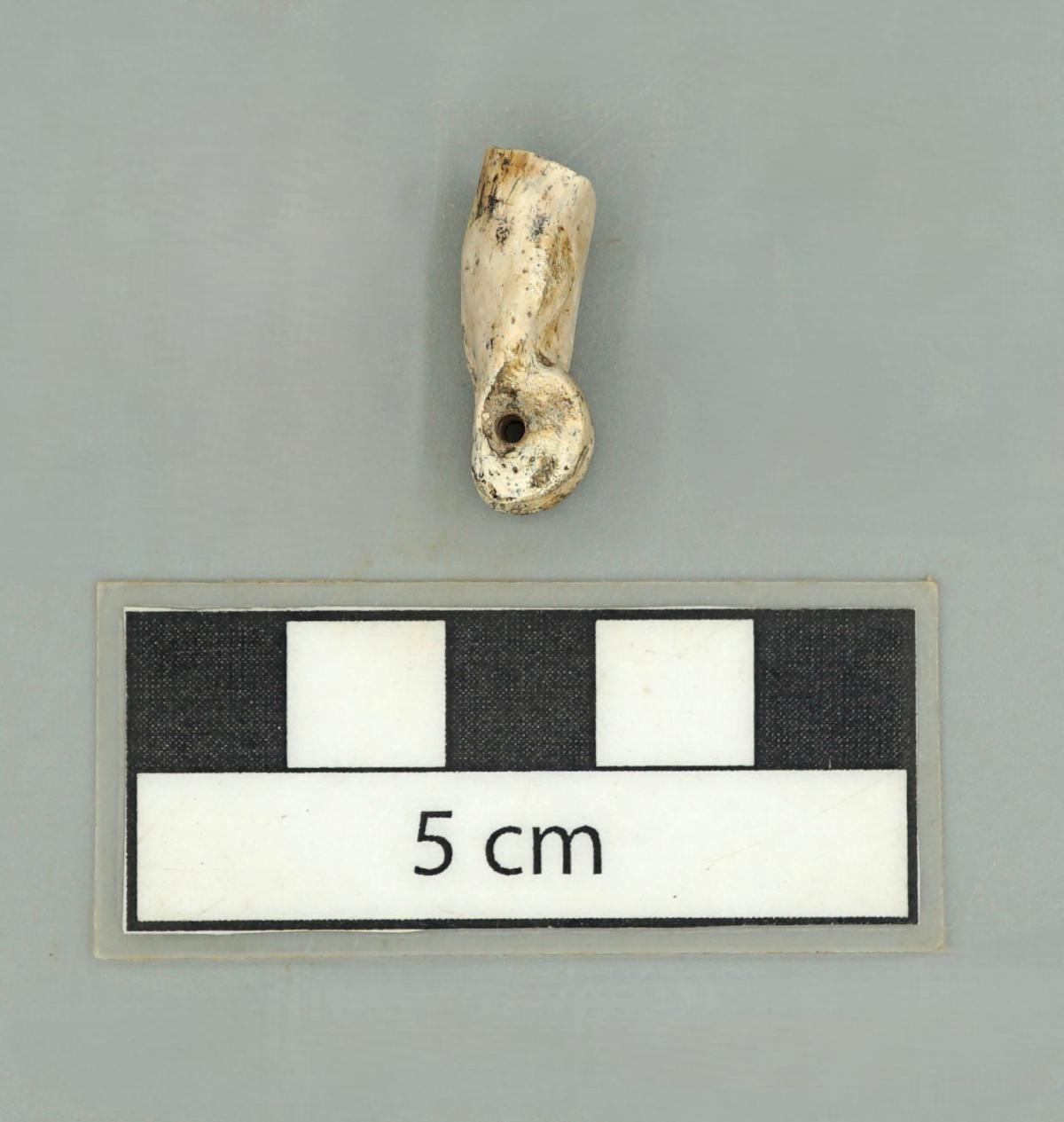 Vista lateral donde se puede ver la perforación que se realizó sobre la falange para ser utilizada como un pendiente.