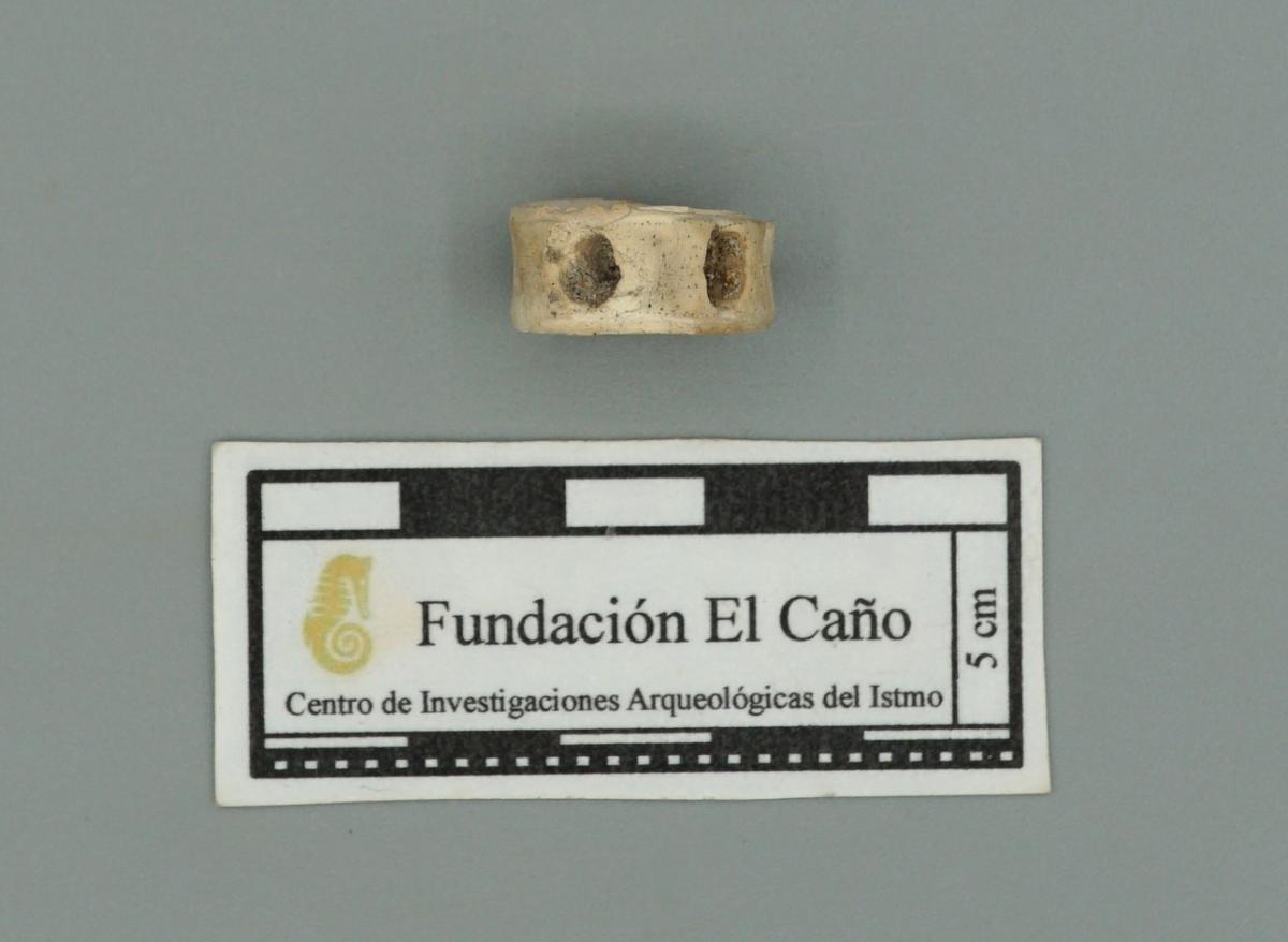 Vista lateral de la vértebra de pescado, donde se observan otras cuantro perforaciones.