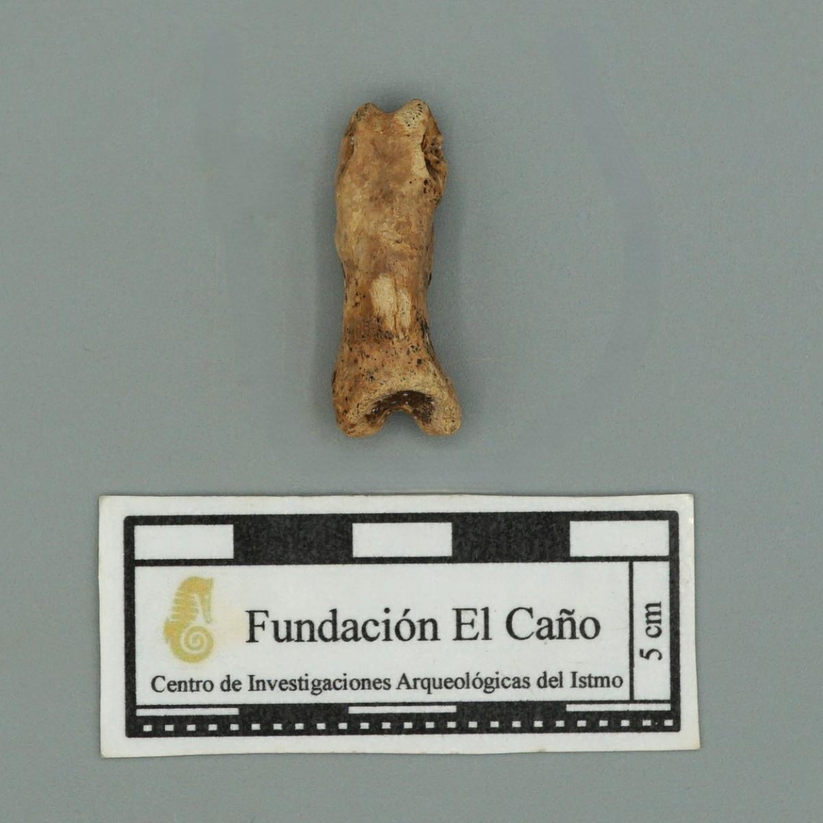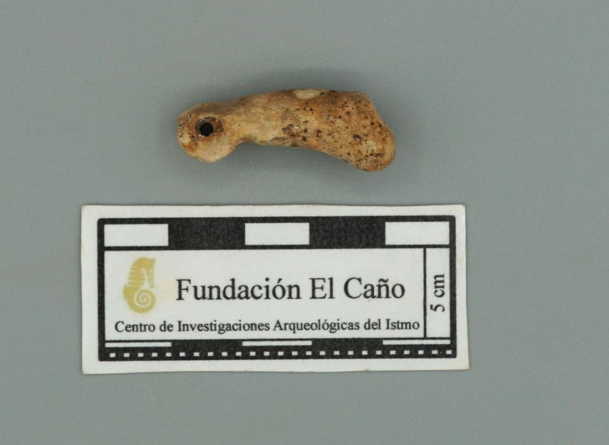 Lateral de la falange de felino HF15266. Se aprecia la perforación que fue realizada para utilizarse como pendiente.