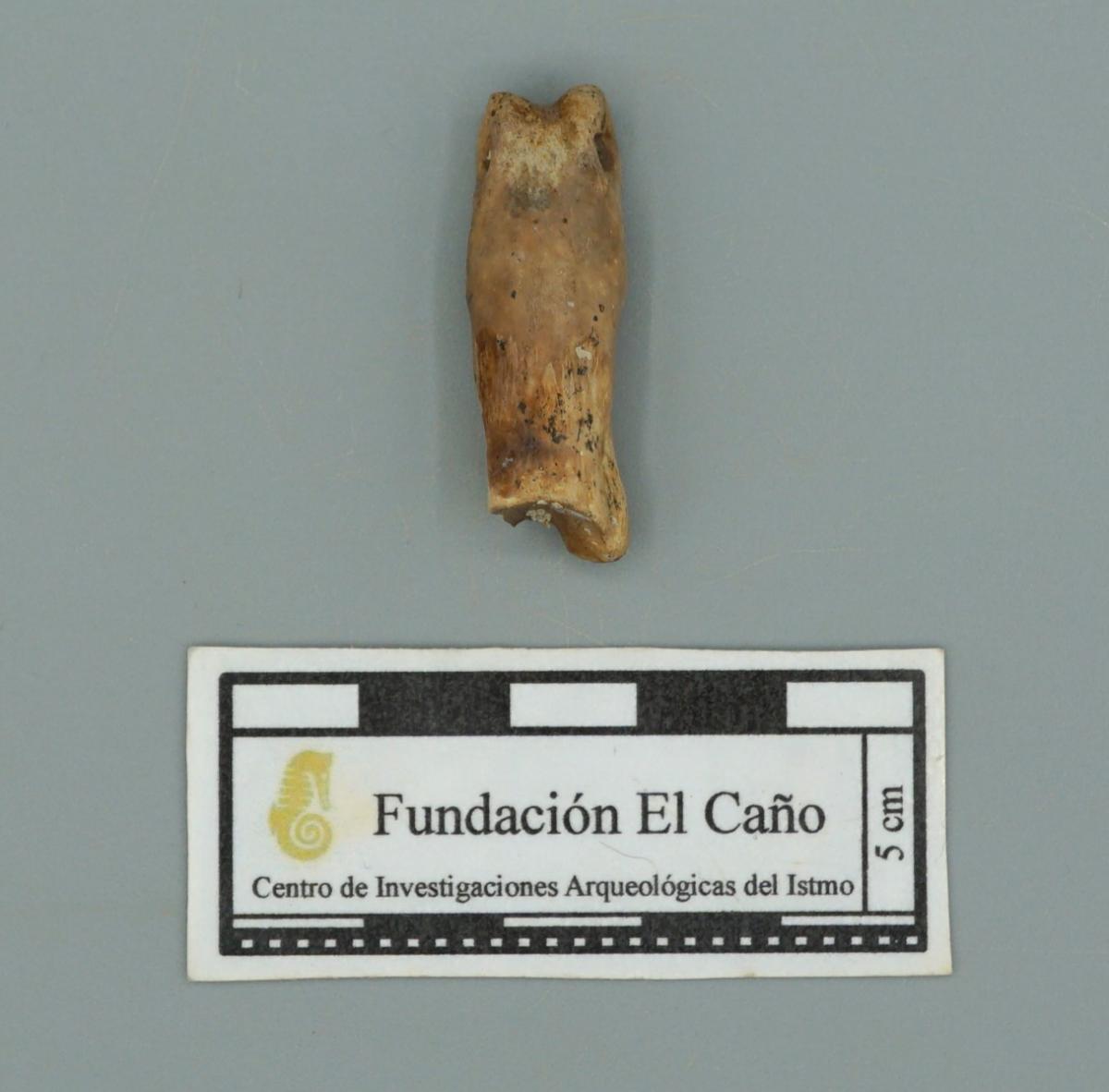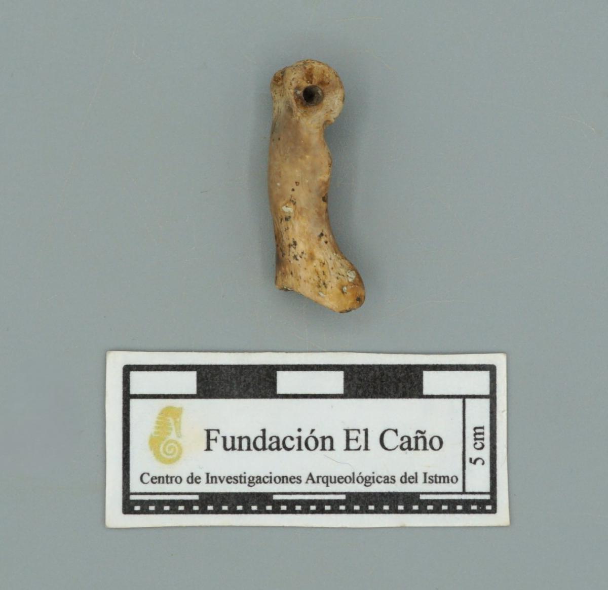 Vista lateral de la falange de felino HF15283. Se puede apreciar la perforación, que sugiere que fue utilizada como colgante.