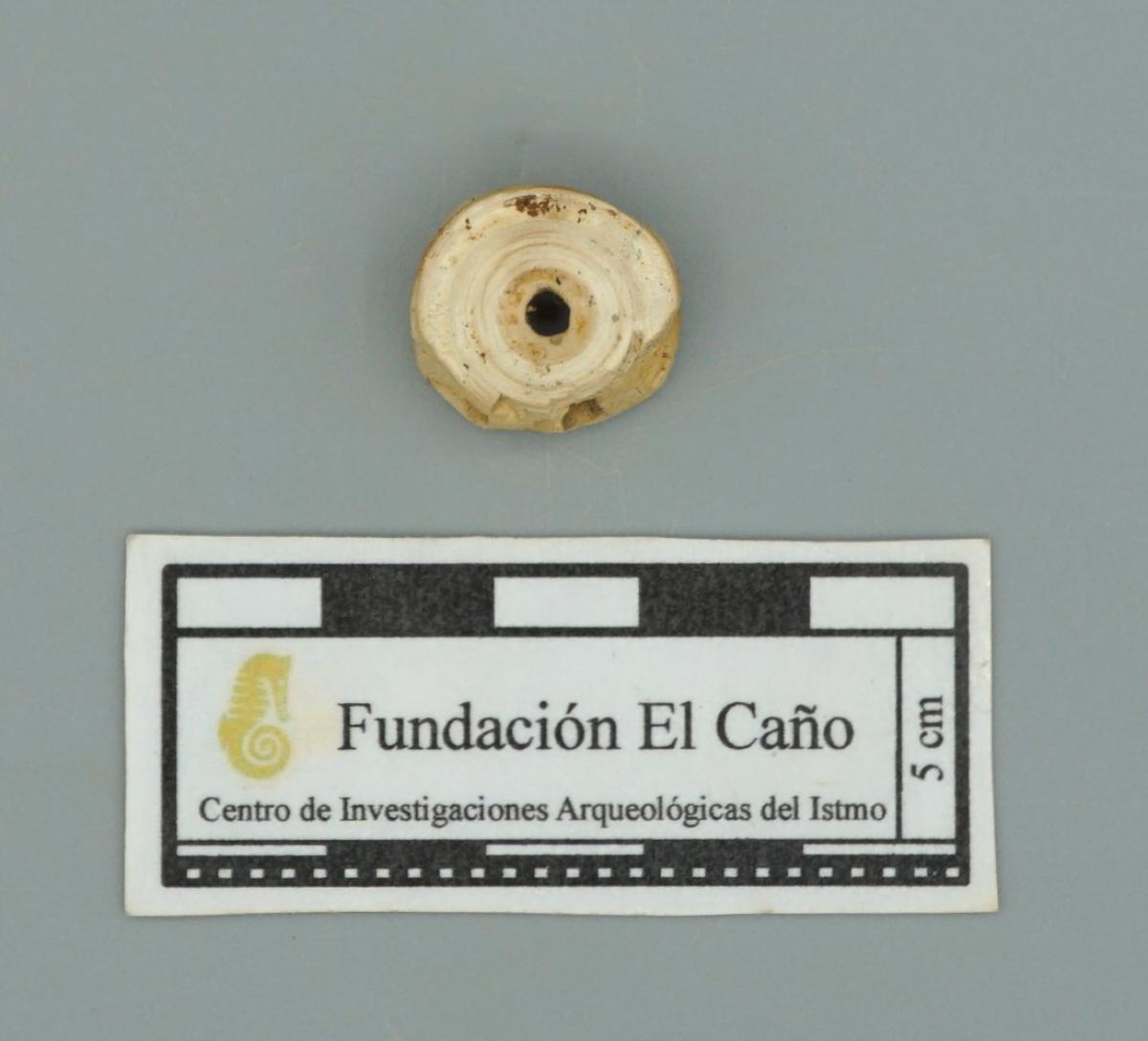 Vértebra de pescado trabajada, con perforaciones en el centro y en los bordes.