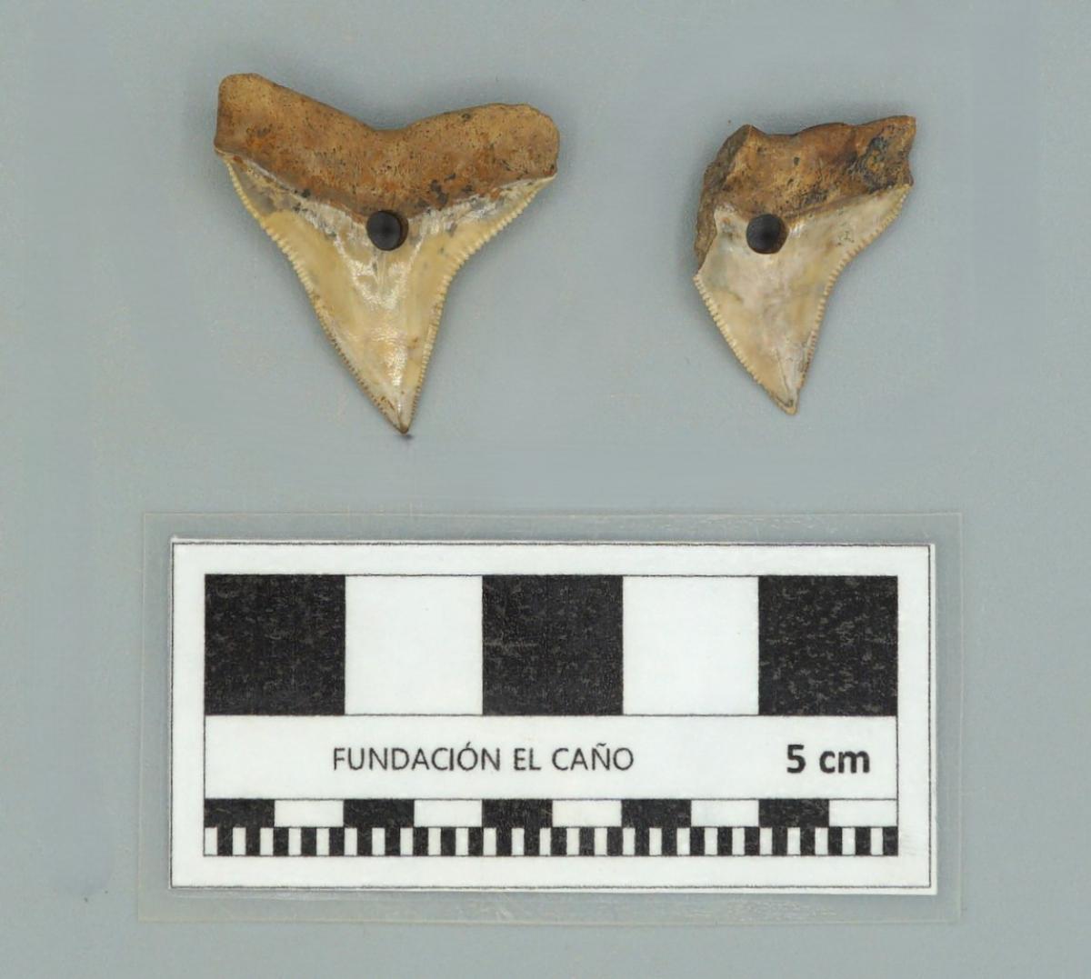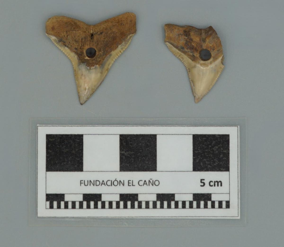 Anverso del pendiente HF7659. Se aprecia la perforación en el diente de tiburón.