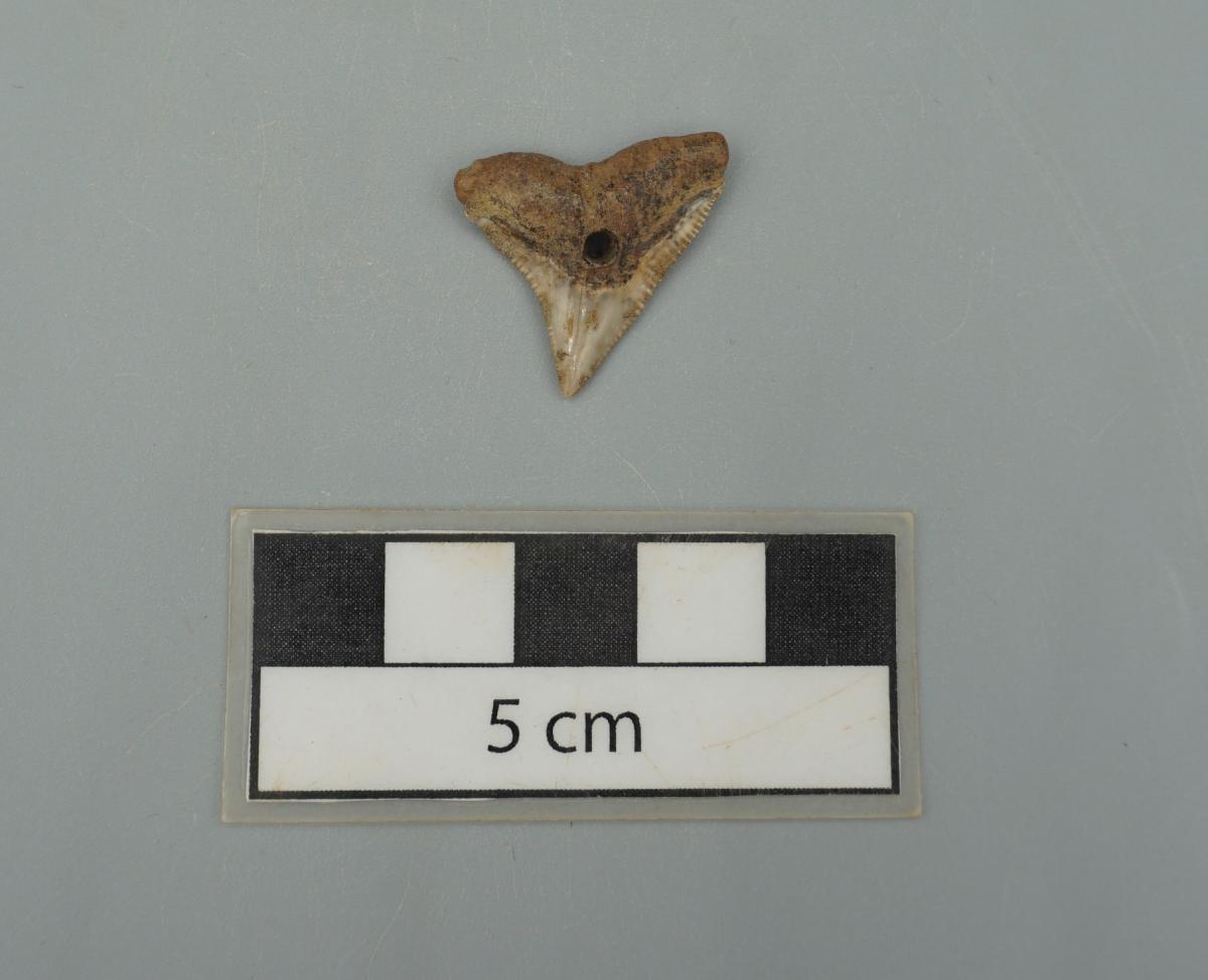 3571 - Diente perforado de tiburón. La perforación indica que pudo haber formado parte de un artefacto ornamental.