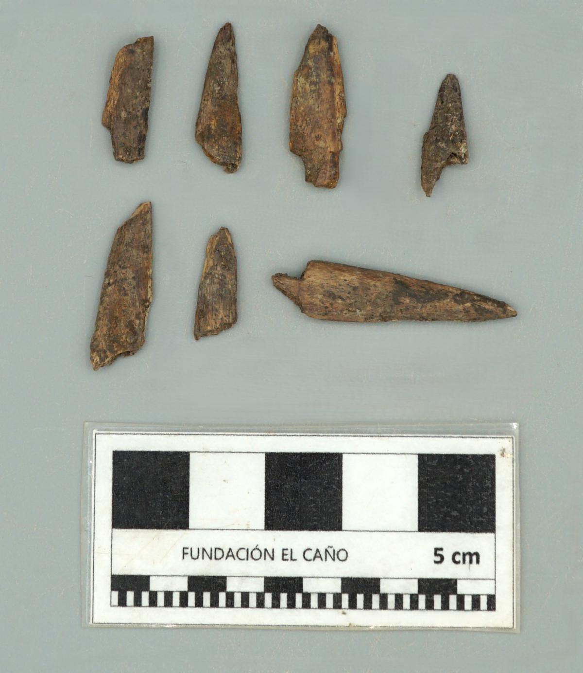Los arpones y fragmentos de arpones elaborados a partir de dentículos de pez sierra fueron hallados en el área del brazo derecho del individuo I14, quien se encontraba en posición prono.