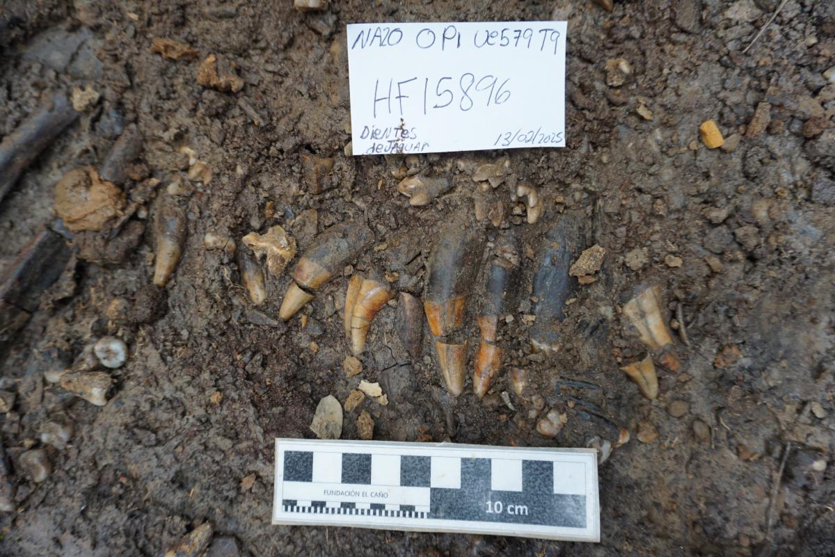 Vista in situ del conjunto de dientes de felino, rodeado por otros dientes perforados pertenecientes a humanos y perros.