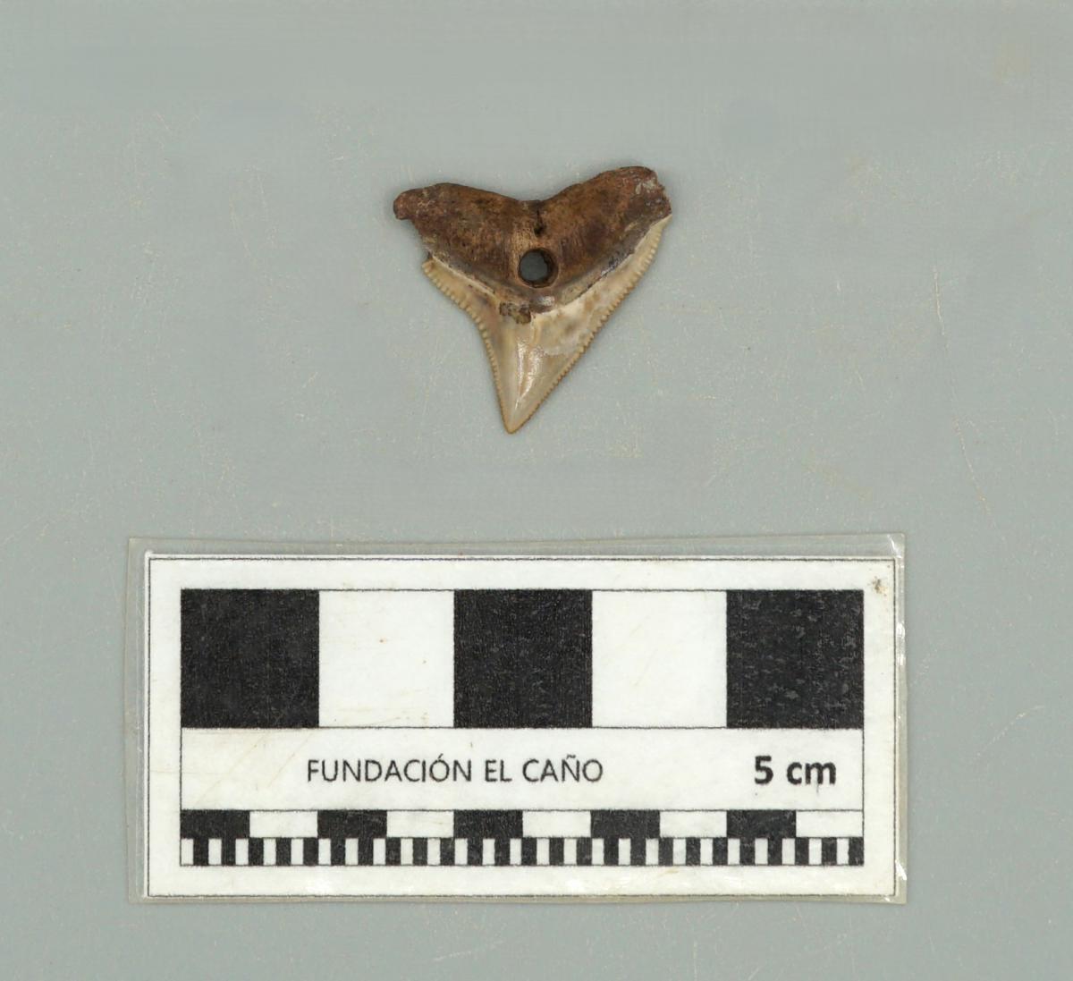 3571 - Diente perforado de tiburón. La perforación indica que pudo haber formado parte de un artefacto ornamental.