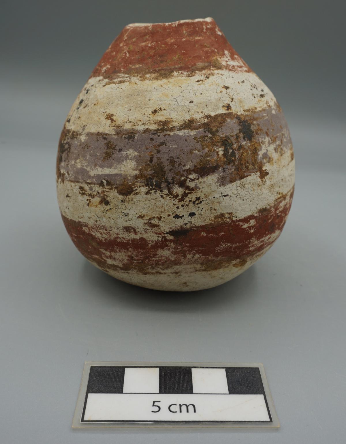Jarra globular policroma de cuello corto, borde recto, sin soporte. Decoración con líneas horizontales.