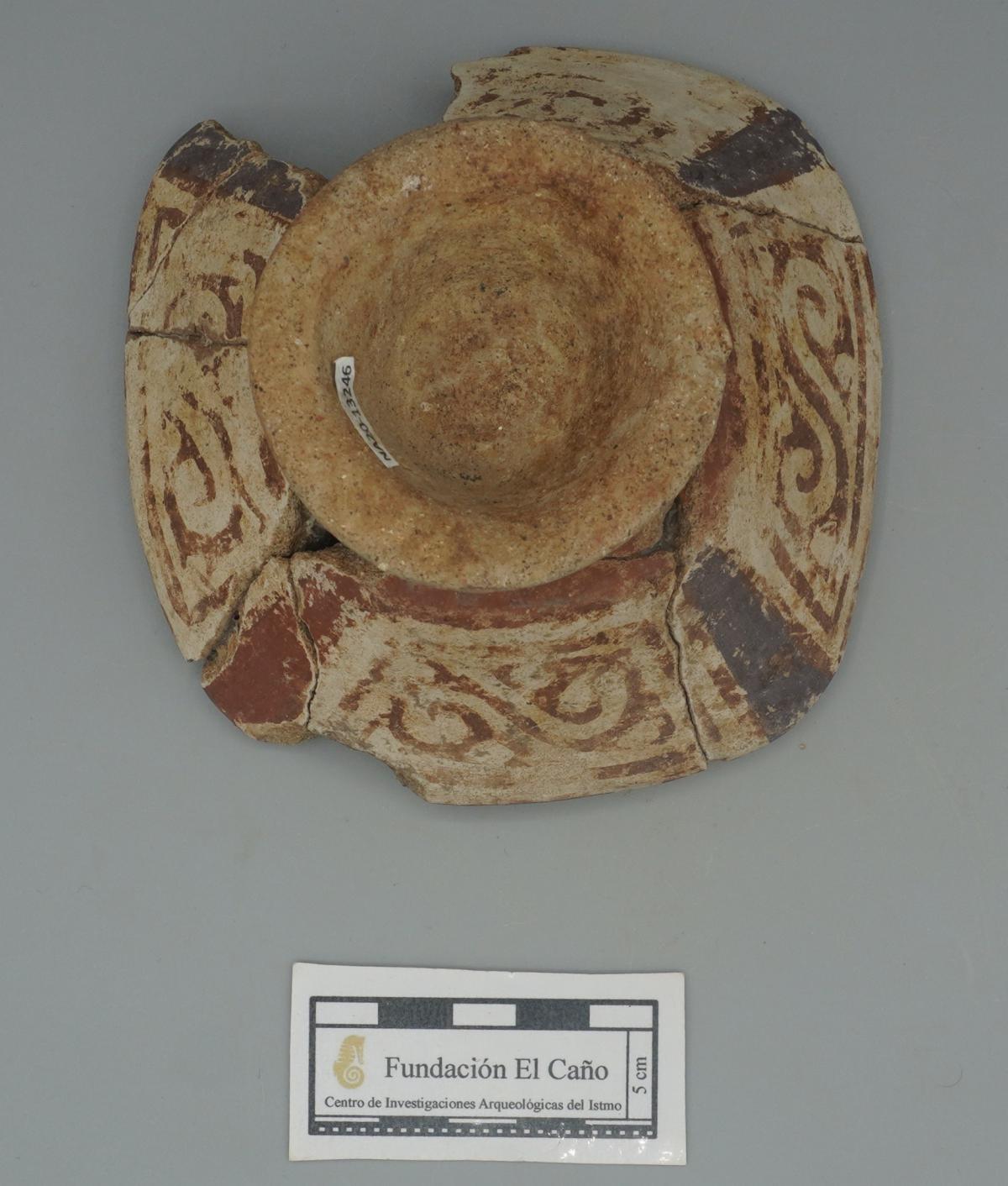 3655 - Cuenco policromo de base plana (sin soporte), con borde engrosado. Presenta engobe rojo en el exterior y blanco en el interior, con la representación de un cangrejo central y paneles geomé...