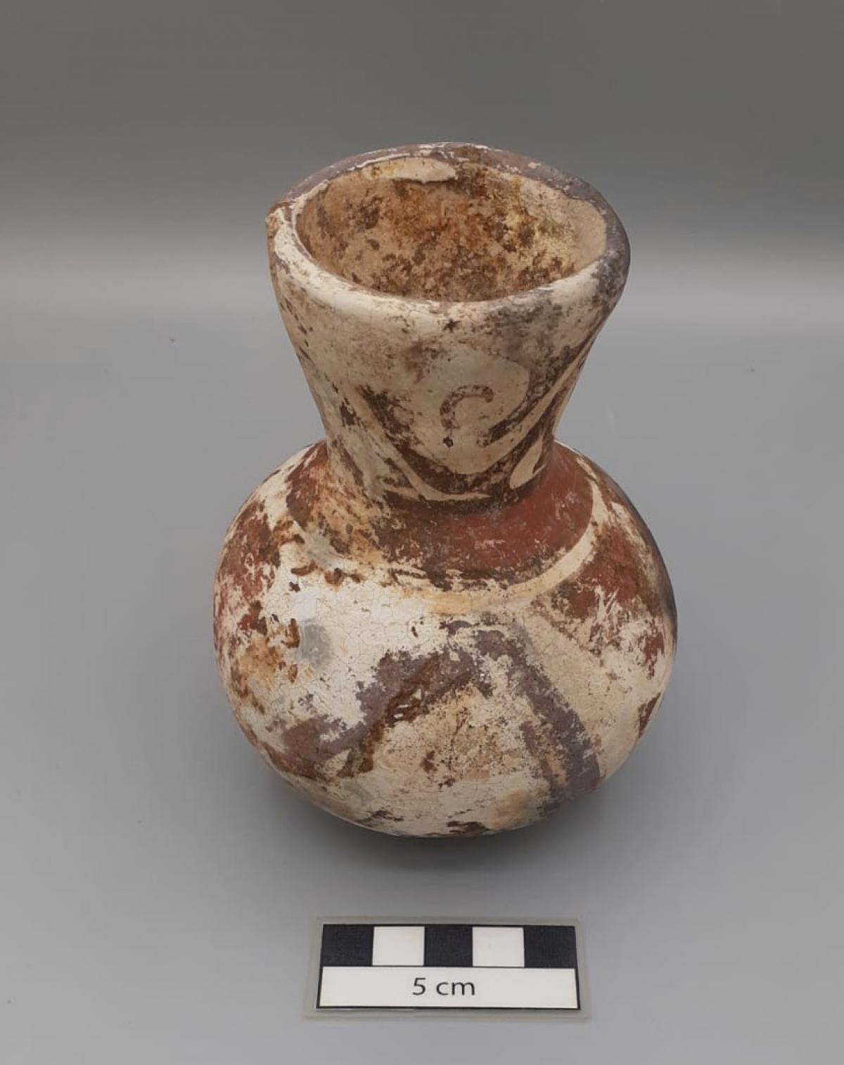 Jarra policroma globular de cuello largo. Presenta una decoración geométrica de espiral continua tipo “YC” a modo de friso en el cuello, y bandas alternas en zigzag sobre el cuerpo.