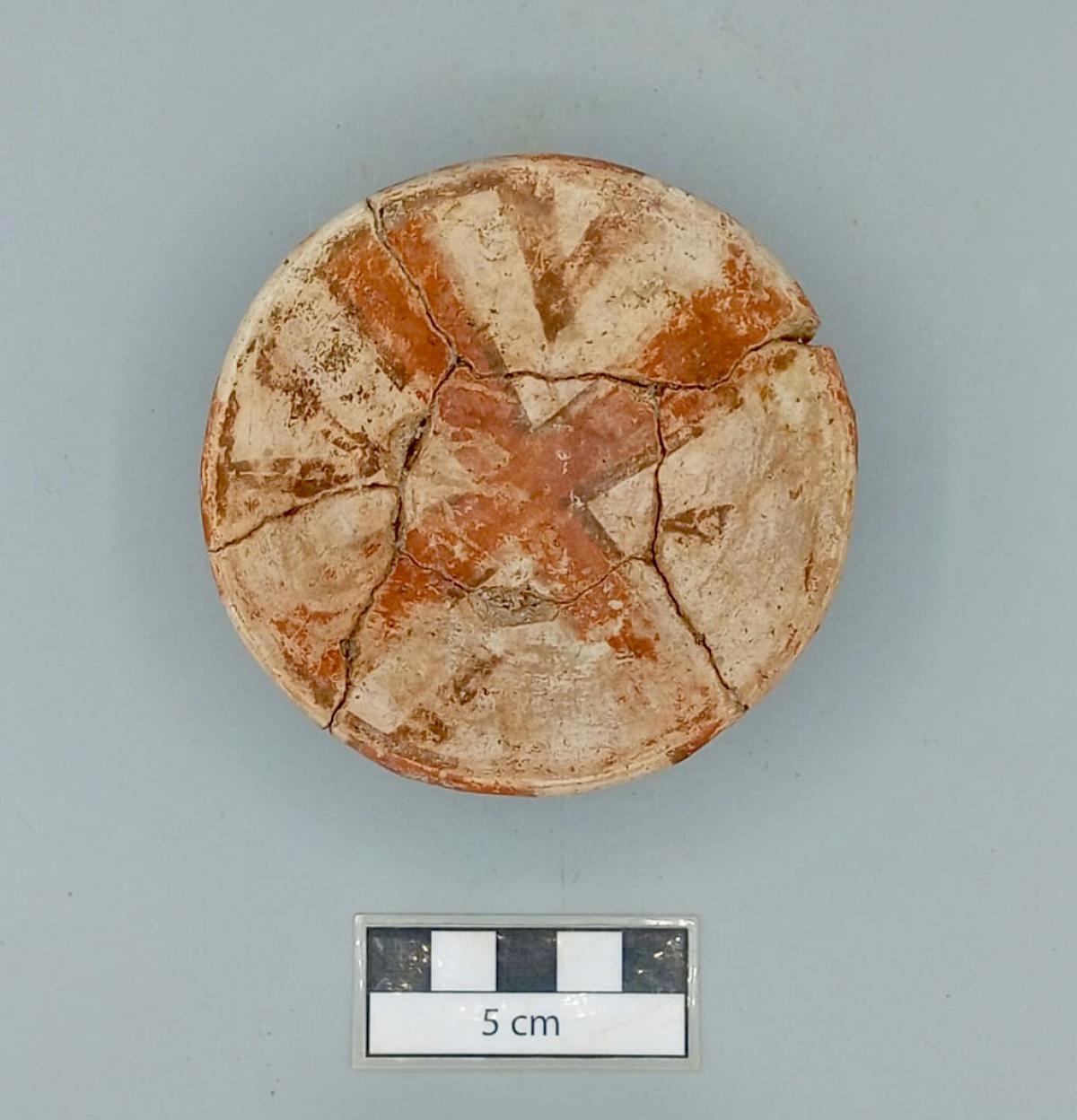 Cuenco policromo con base anular y borde engrosado, decorado con motivos geométricos en forma de “X” y “V”