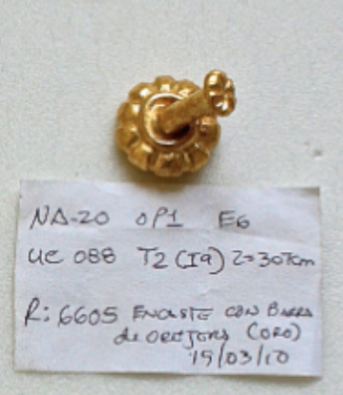 377 - Pendiente figurativo de oro fundido con la representación de un murciélago bicéfalo en vuelo que formaba parte del ajuar del individuo I5 de la tumba T2. EL aro de suspensión se localiza...
