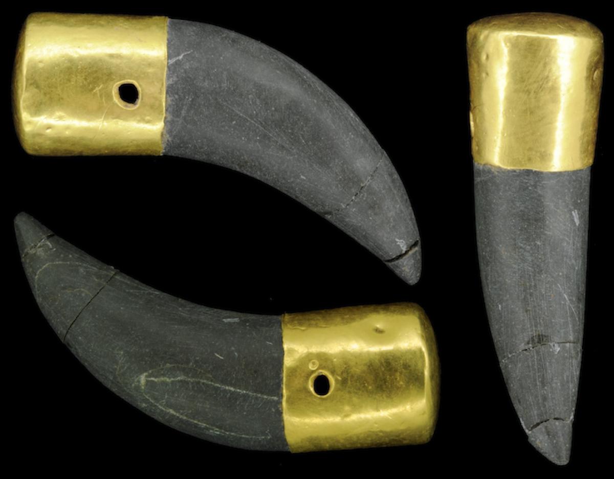 Pendiente de piedra con funda de oro en forma de colmillo.