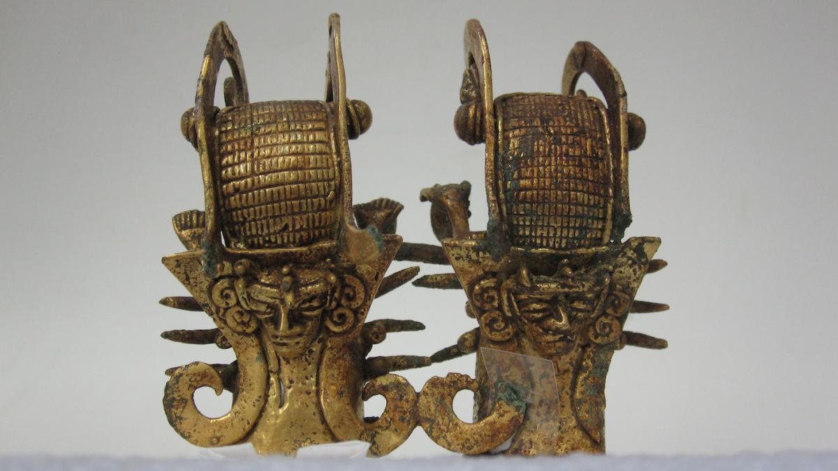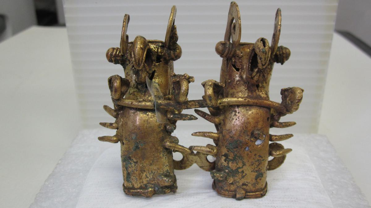 Vista frontal del pendiente figurativo de tumbaga fundido que formaba parte del ajuar del individuo I1 de la tumba T1. Estilo Conte. 6.5 cm. de alto. La figura tiene dos posibles lecturas: dos langostas espinosas sobrenaturales portan sendas cabezas humanas en sus carapachos o bien dos personajes cargan las langostas a sus espaldas.