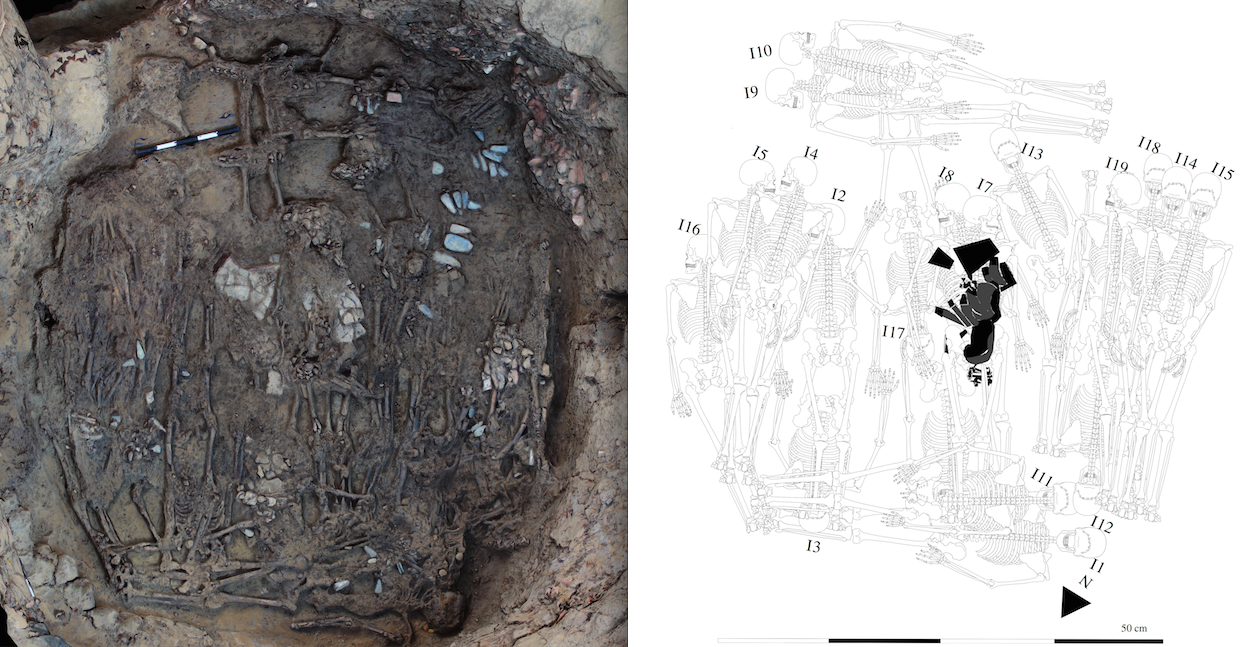 375 - T2-UE088. Depósito de artefactos y osamentas localizado a una profundidad de 2,20 m sobre la Plataforma II (piso más alto) de la tumba T2. Todos los cuerpos fueron colocados en decúbito v...