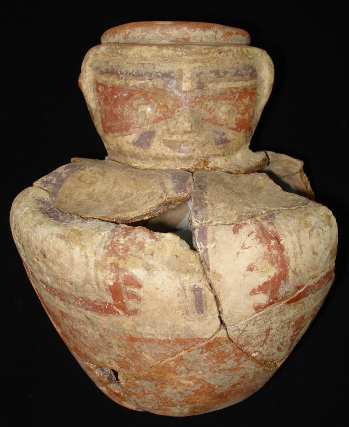 3636 - efigie antropomorfa. Cuerpo de tendencia globular sin base anular y sin asa de apoyo. La decoración en brazos y cara representan con pinturas corporales o tatuajes