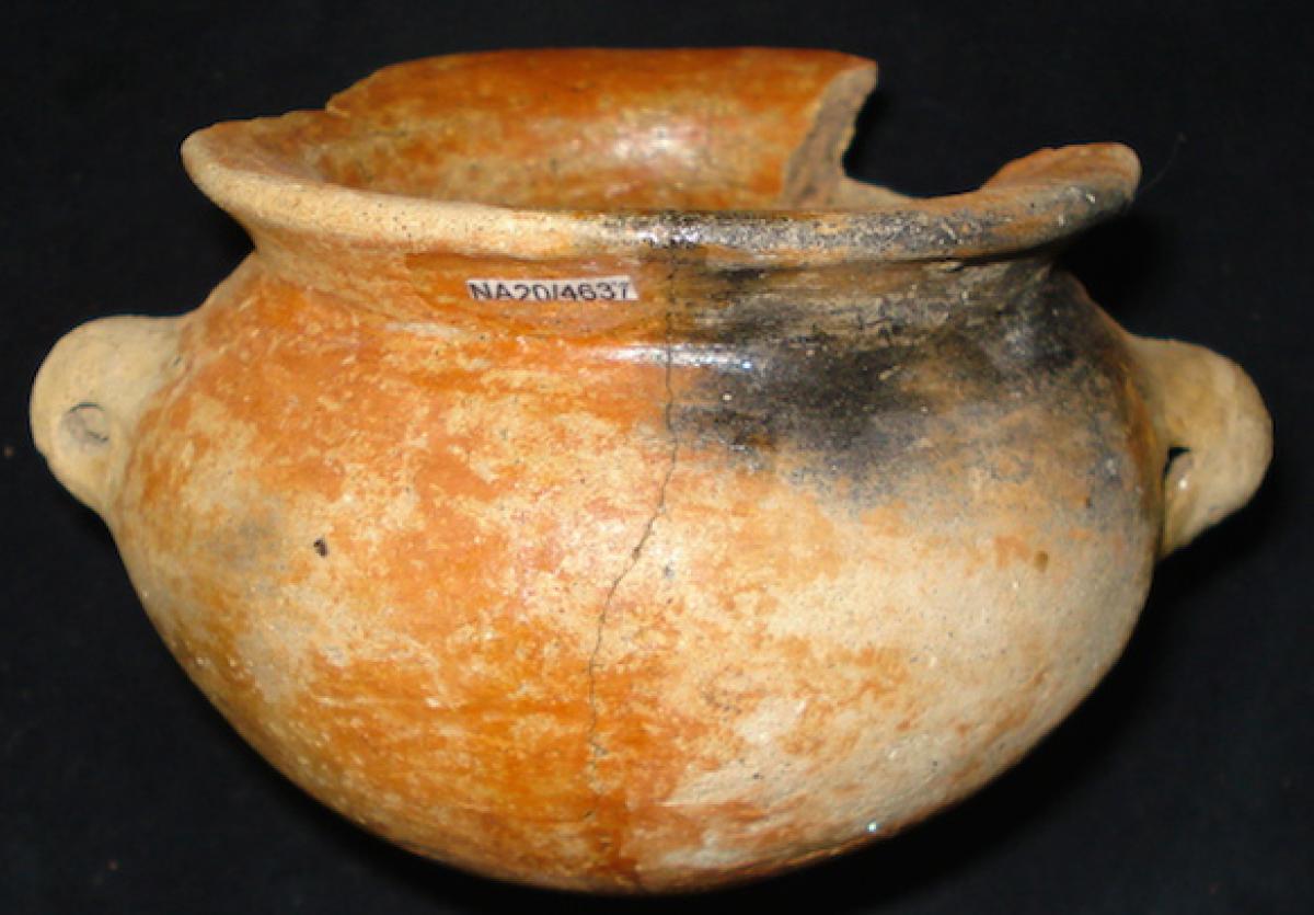 3566 - Jarra globular de base anular, cuello corto y borde plano. Engobe rojo en la superficie exterior.
