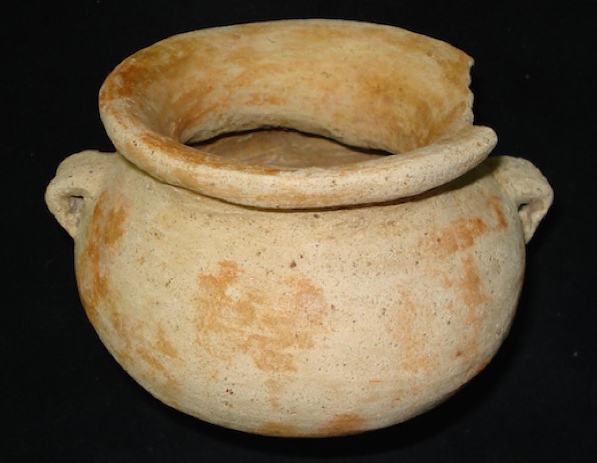 3560 - Olla con borde envesado, con línea roja y asa en el cuerpo, sin soporte.