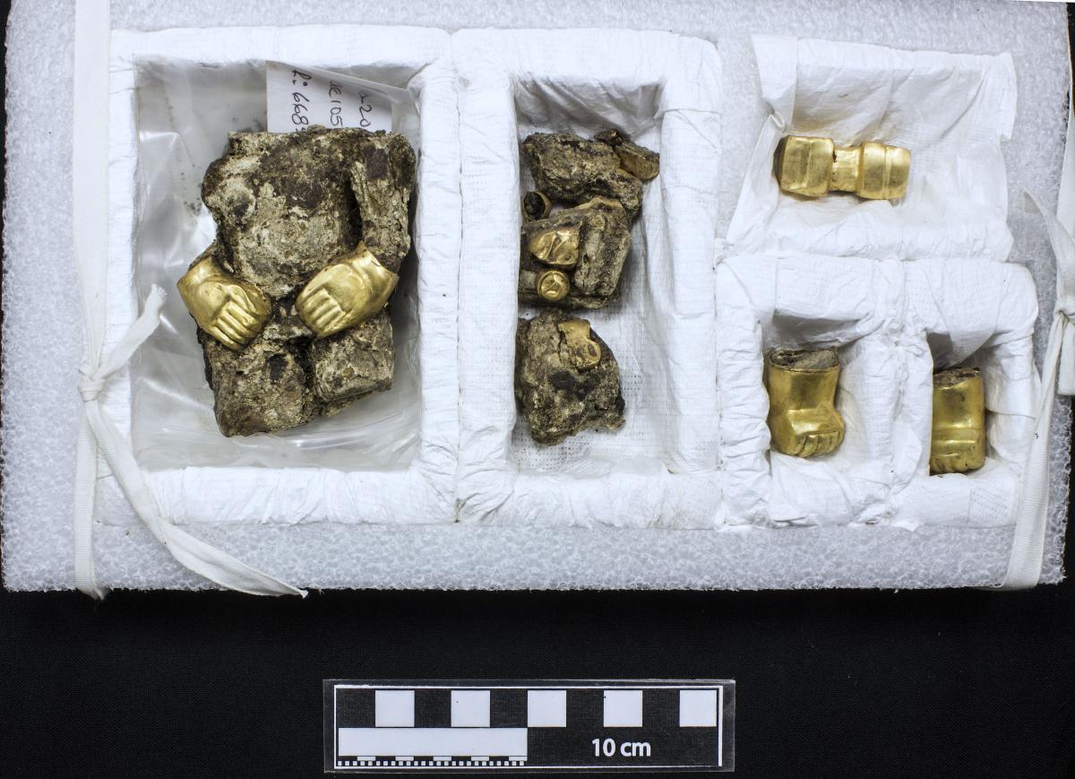 387 - Pectoral de oro martillado repujado con la representación frontal del rostro de un ser sobrenatural con rasgos de un anciano que formaba parte del ajuar del Individuo 20, un infante, de la ...