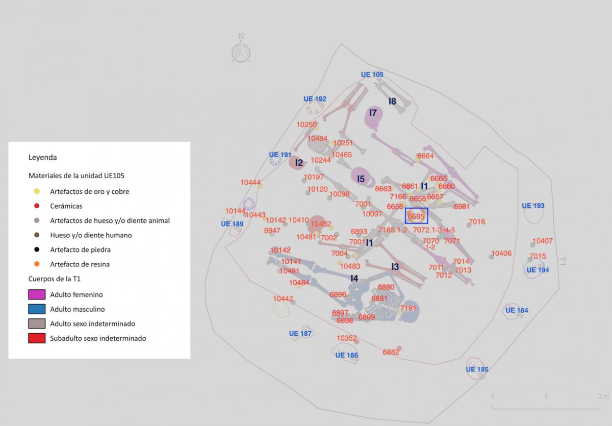 375 - T2-UE088. Depósito de artefactos y osamentas localizado a una profundidad de 2,20 m sobre la Plataforma II (piso más alto) de la tumba T2. Todos los cuerpos fueron colocados en decúbito v...
