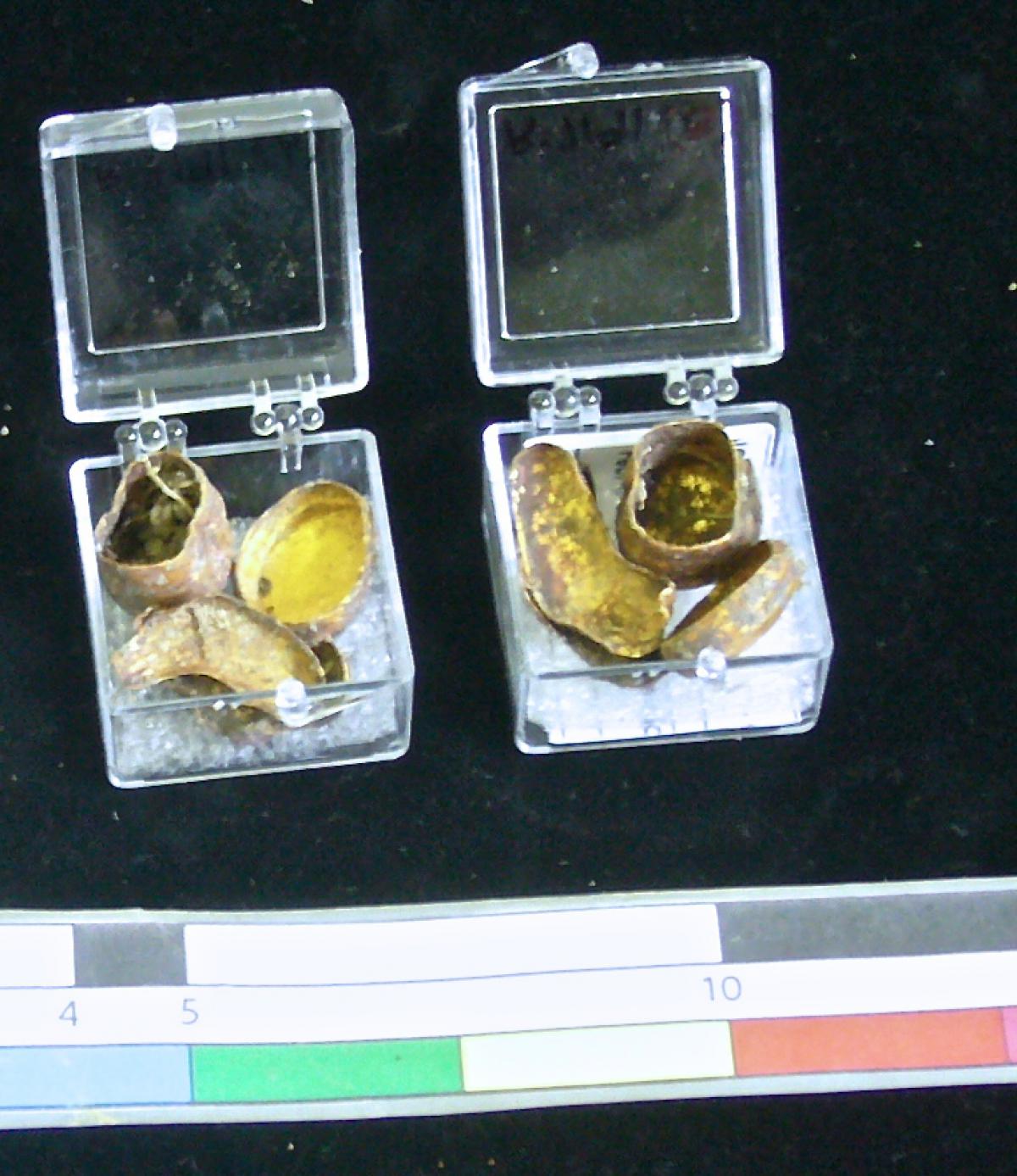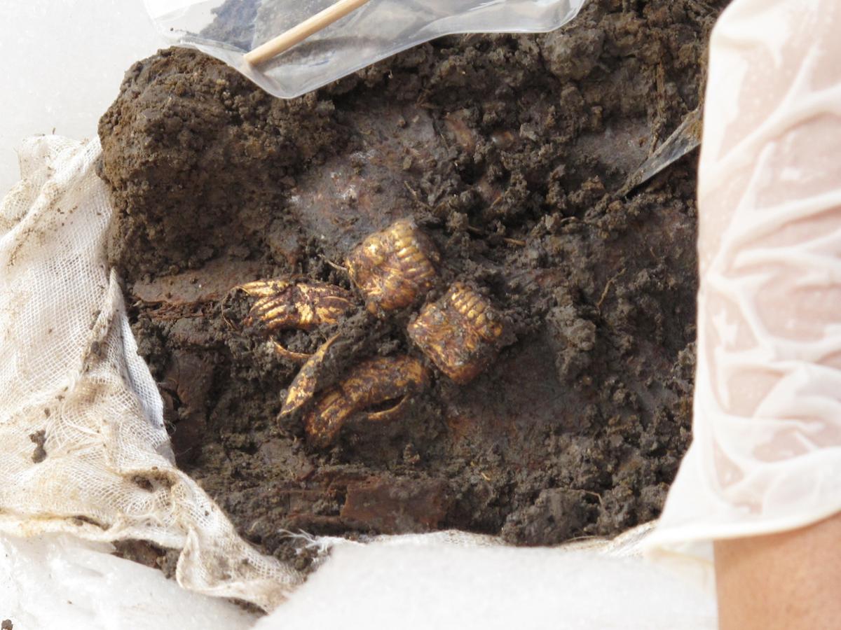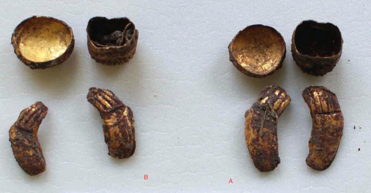 Fundas laminares de oro que recubrían parte de cabeza y ambas extremidades de una figura doble de algún tipo de material perecedero (resina o madera) no conservado que formaba parte del ajuar del individuo I4 de la tumba T1.