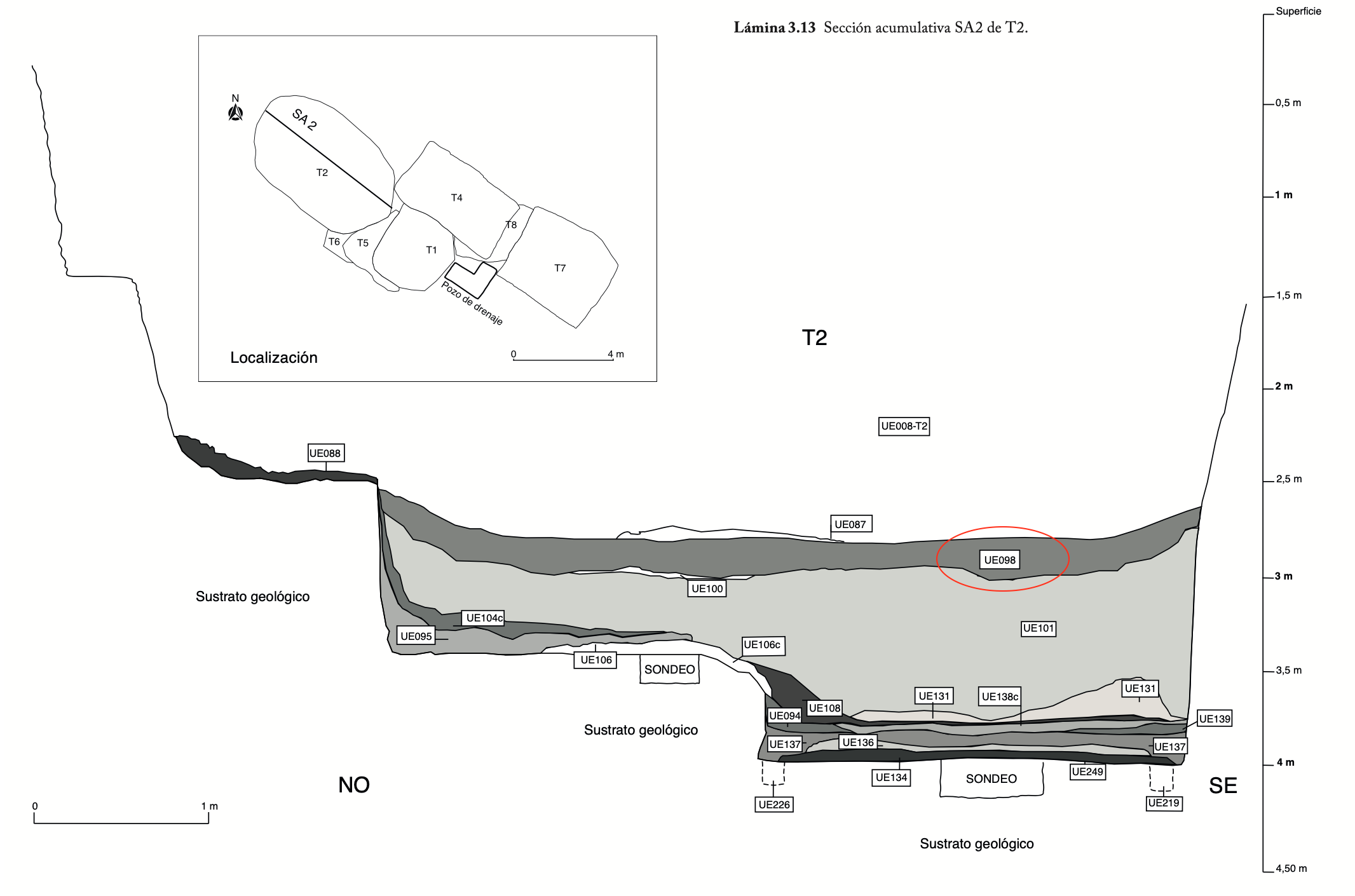 381 - T6-UE125 (a , (llamado en el año 2013, unidad UE167).Entierro de la tumba T6. Depósito de huesos humanos en posición primaria localizado a 3,48 m de profundidad. Es un entierro múltiple...