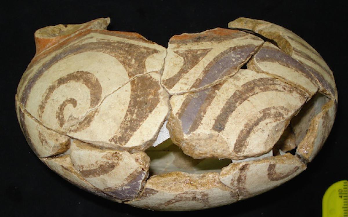 384 - Cuenco carenado cerrado de doble englobe (rojo y blanco). Decoración geométrica de espirales "yc".