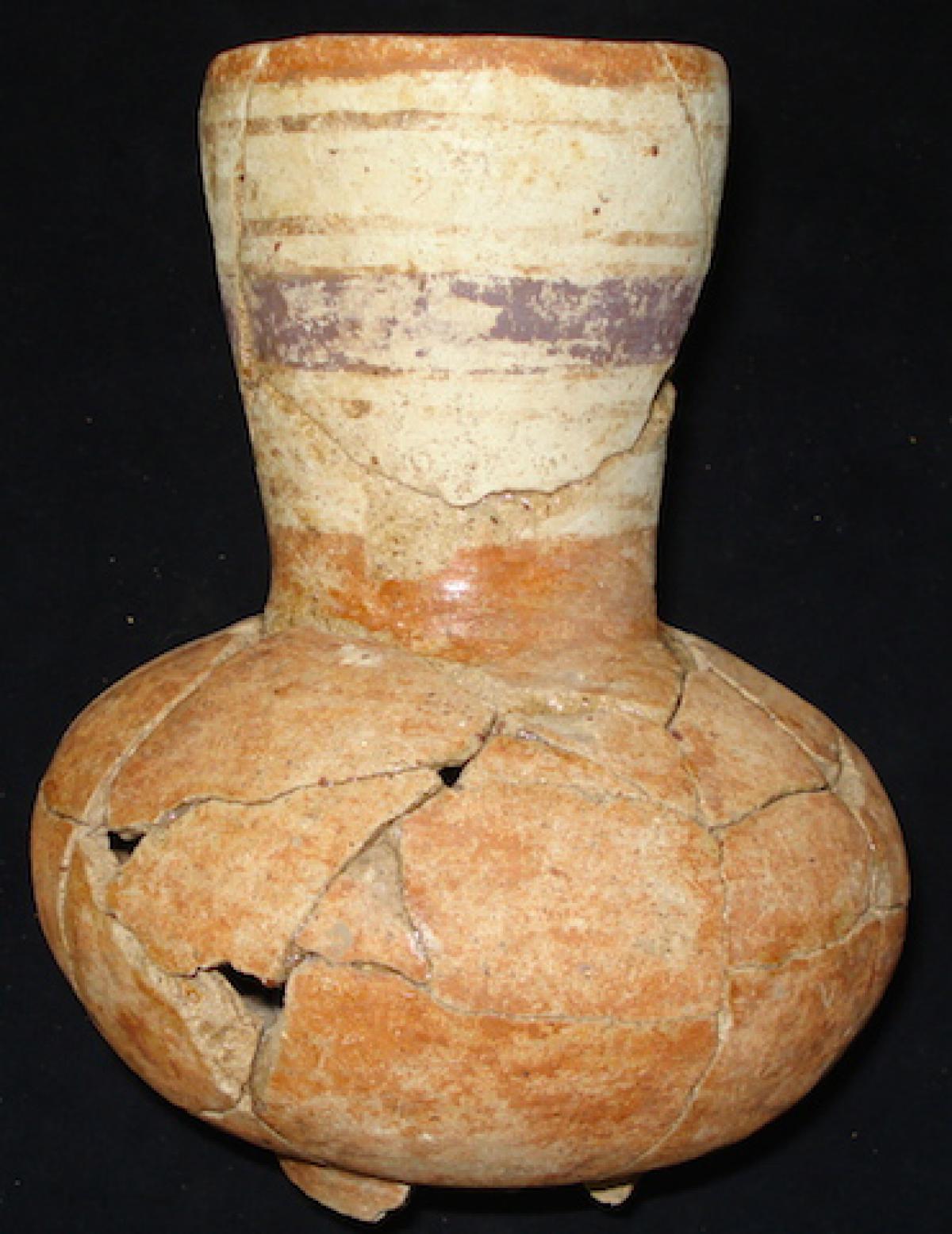 376 - Jarra polícroma carenada con hombros alzados y cuello largo. Engobe blanco y decoración de bandas de color alternas rojas y moradas.